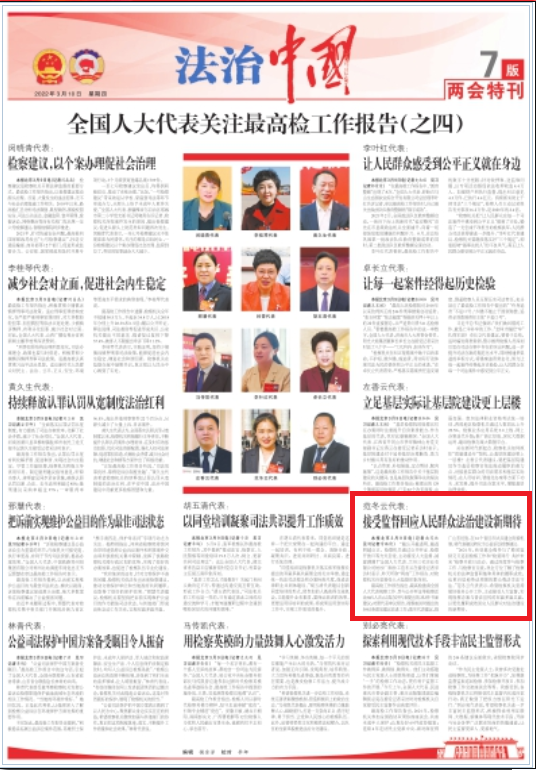 2022年3月10日检察日报七版刊发《全国人大代表、兰州三毛实业有限公司纺纱厂细纱工范冬云:接受监督回应人民群众法治建设新期待》。