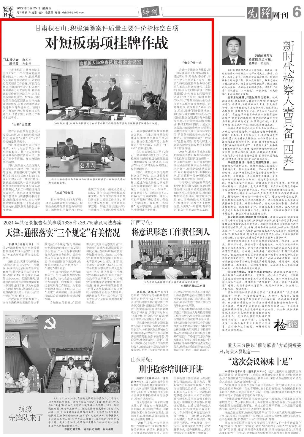 2022年3月25日检察日报六版刊发《对短板弱项挂牌作战——甘肃积石山:积极消除案件质量主要评价指标空白项》。