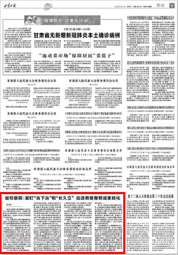 2022年4月1日甘肃日报二版刊发《省检察院:紧盯“当下治”和“长久立” 促进教育整顿成果转化》。