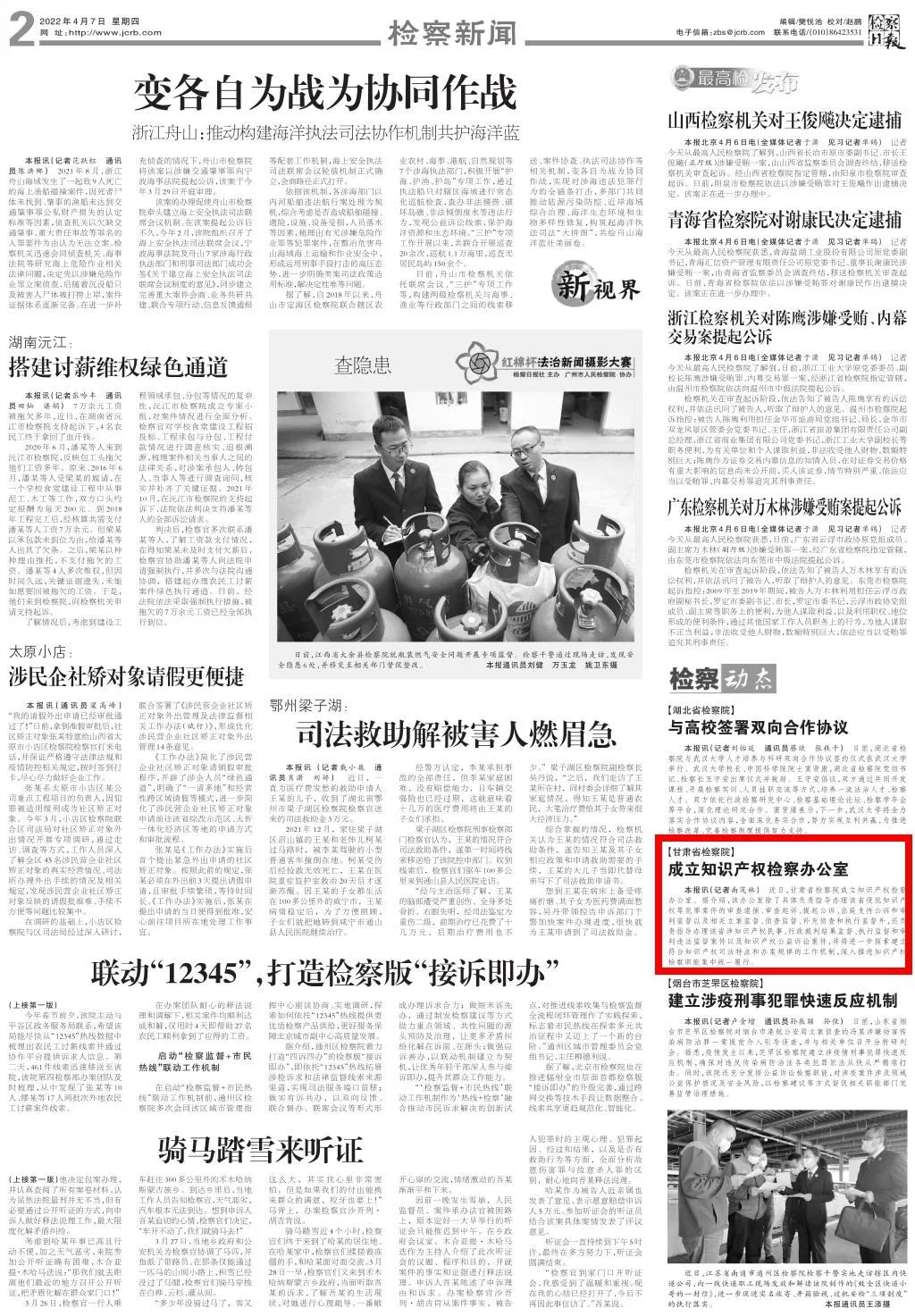 成立知识产权检察办公室。据介绍,该办公室除了具体负责指导办理该省侵犯知识产权等犯罪案件的审查逮捕、审查起诉、提起公诉、出庭支持公诉和审判监督以及相关立案监督、侦查监督、补充侦查和执行监督外,还负责指导办理该省涉知识产权民事、行政裁判结果监督、执行监督和审判违法监督案件以及知识产权公益诉讼案件,并将进一步探索建立符合知识产权司法特点和办案规律的工作机制,深入推进知识产权检察职能集中统一履行。