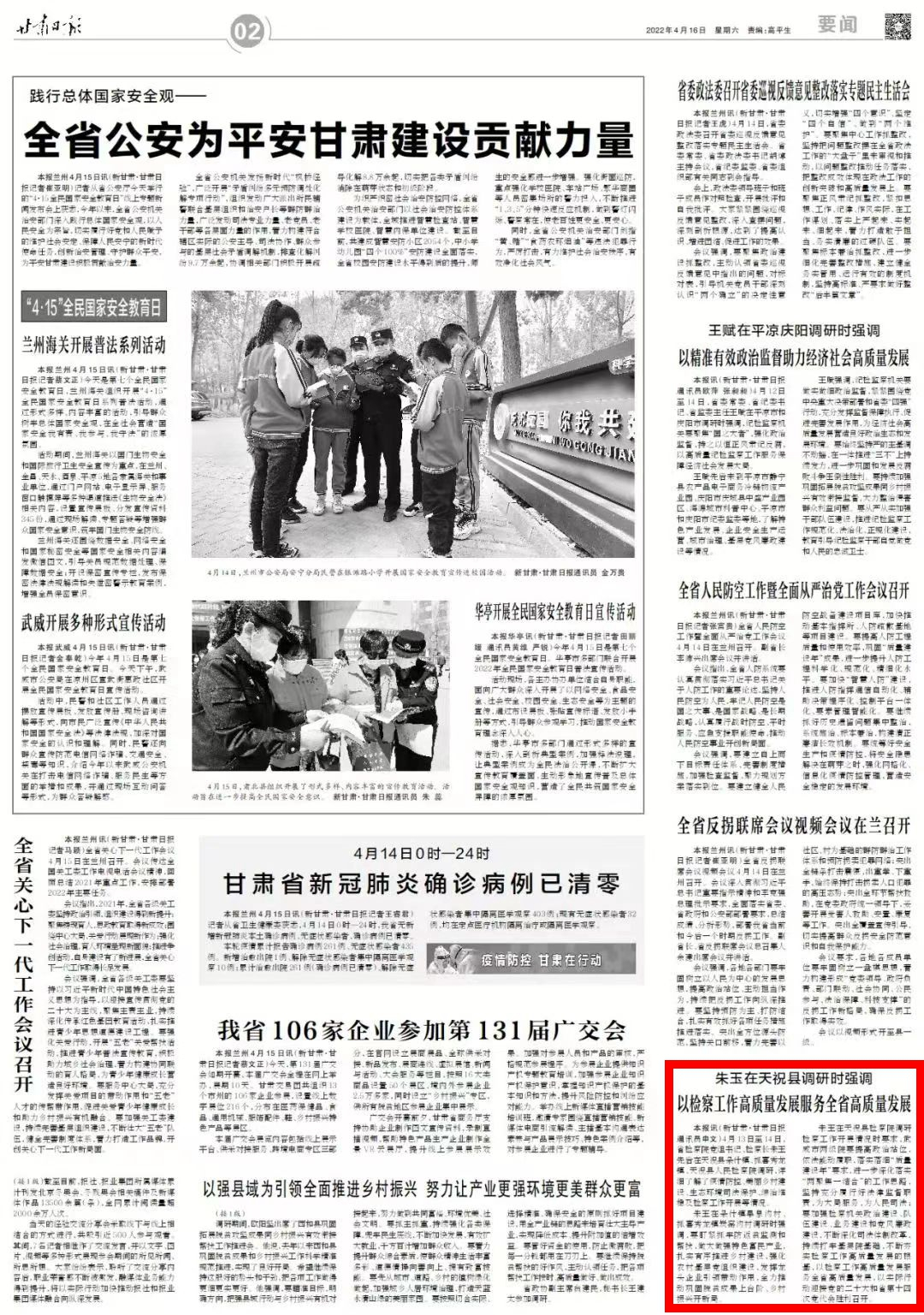 2022年4月16日,甘肃日报二版刊发新闻《朱玉在天祝县调研时强调:以检察工作高质量发展服务全省高质量发展》。