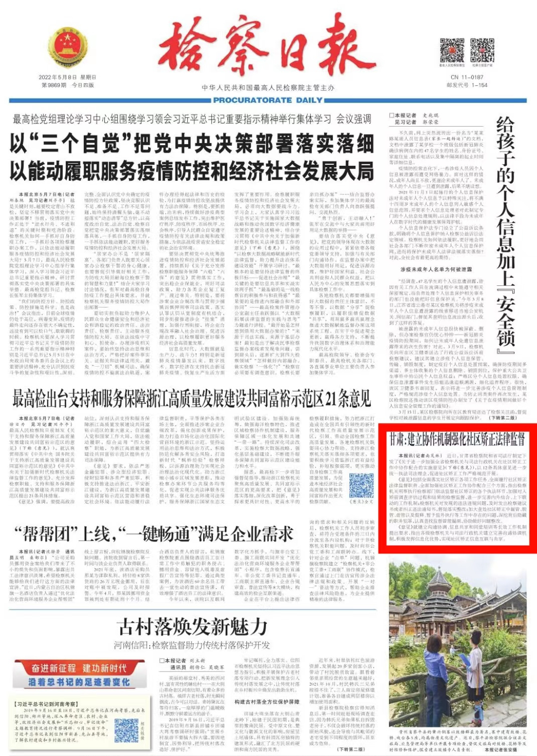 2022年5月8日,检察日报头版刊发《甘肃:建立协作机制强化社区矫正法律监督》。