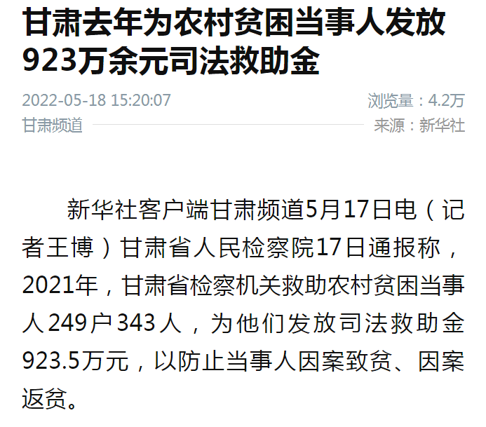 2022年5月18日,新华社发布《甘肃去年为农村贫困当事人发放923万余元司法救助金》。
