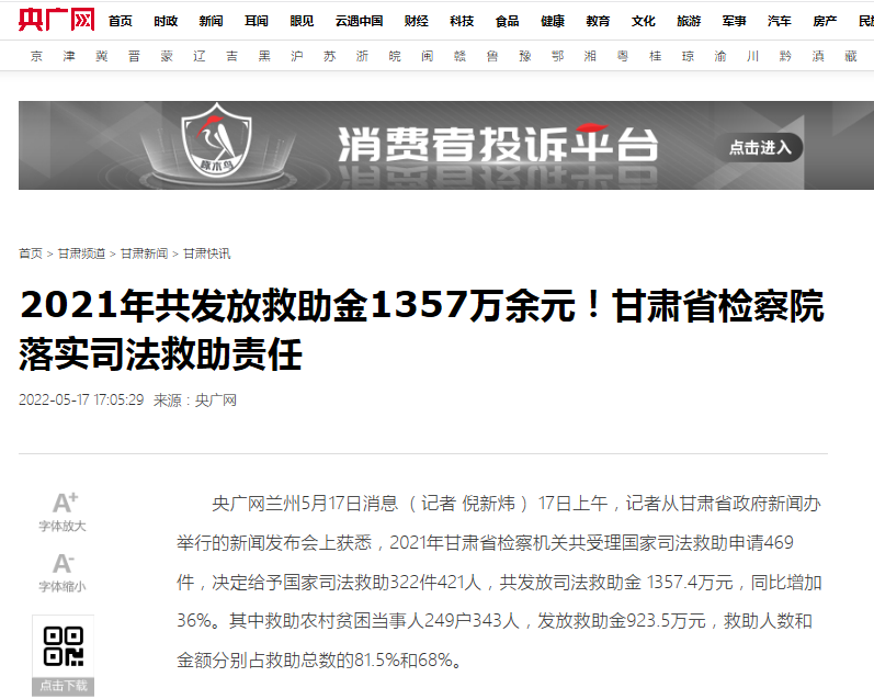 央广网兰州5月17日消息 (记者 倪新炜) 17日上午,记者从甘肃省政府新闻办举行的新闻发布会上获悉,2021年甘肃省检察机关共受理国家司法救助申请469件,决定给予国家司法救助322件421人,共发放司法救助金 1357.4万元,同比增加36%。其中救助农村贫困当事人249户343人,发放救助金923.5万元,救助人数和金额分别占救助总数的81.5%和68%。