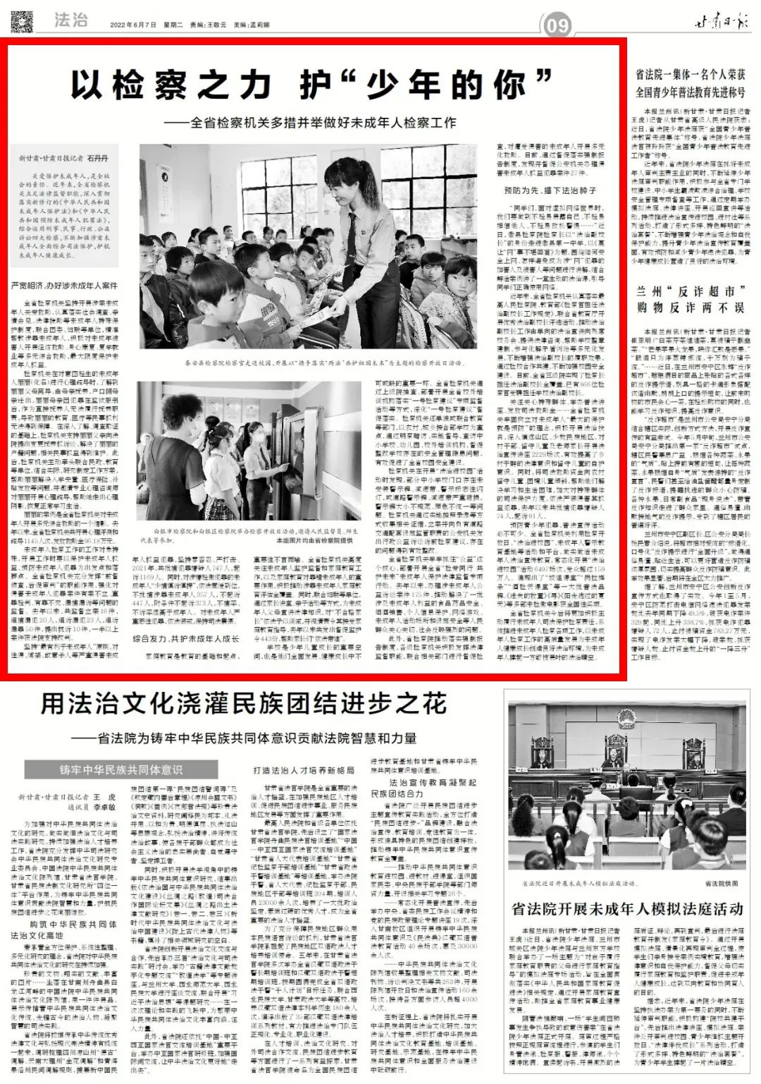 2022年6月7日,甘肃日报九版刊发《以检察之力 护“少年的你”——全省检察机关多措并举做好未成年人检察工作》。