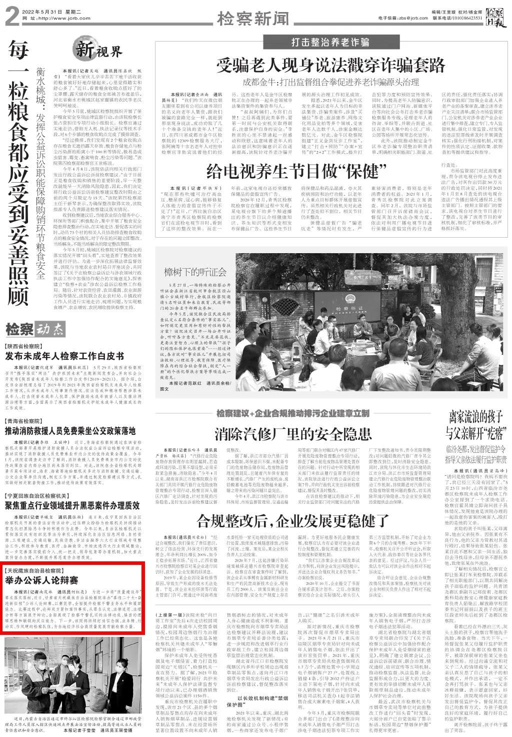 2022年5月31日,检察日报二版刊发《天祝藏族自治县检察院:举办公诉人论辩赛》。