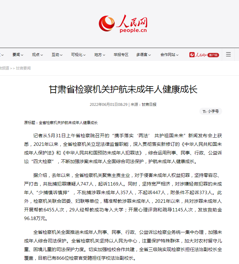 2022年6月1日,人民网发布《甘肃省检察机关护航未成年人健康成长》。