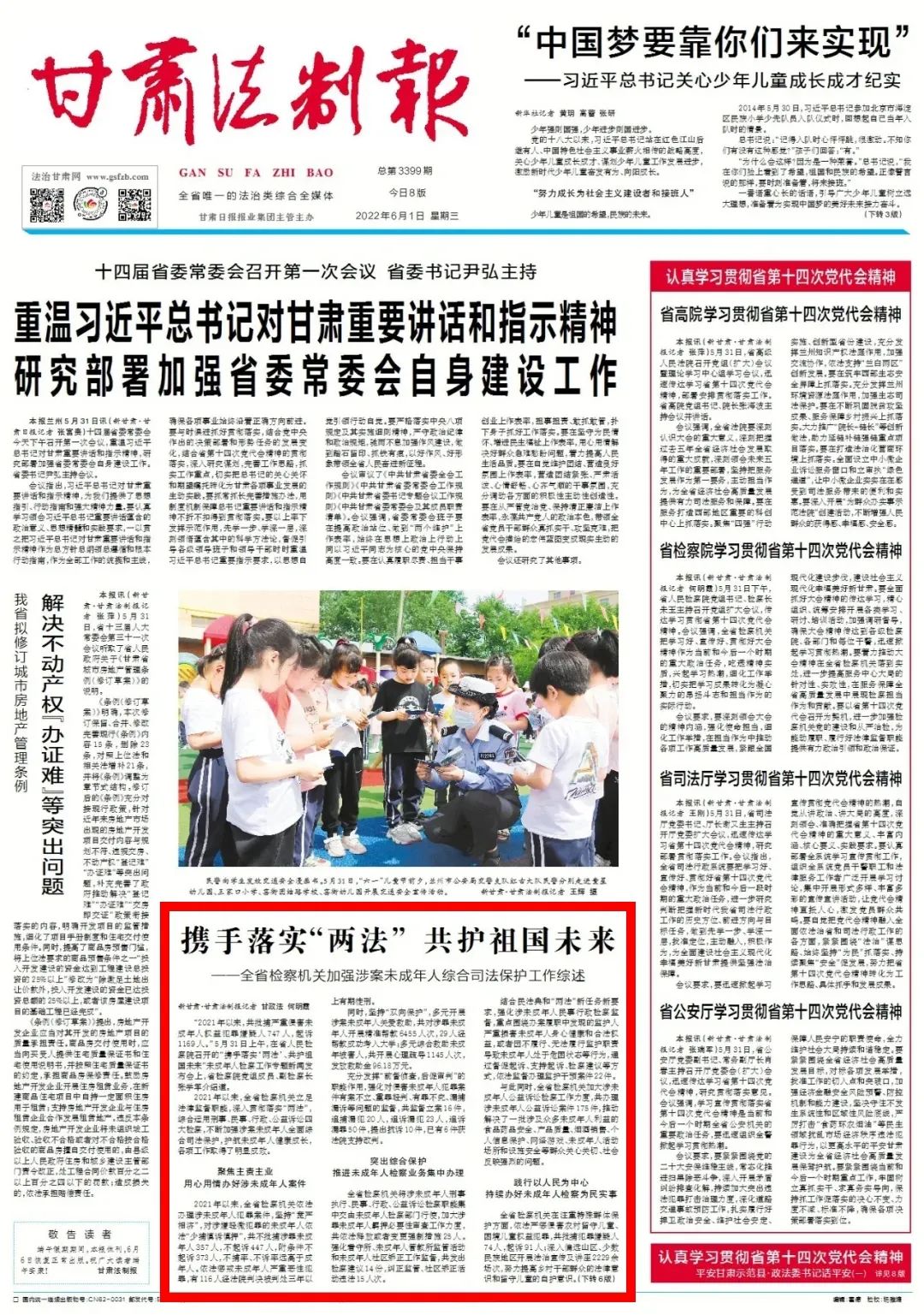2022年6月1日,甘肃法制报头版刊发《携手落实“两法” 共护祖国未来——全省检察机关加强涉案未成年人综合司法保护工作综述》。