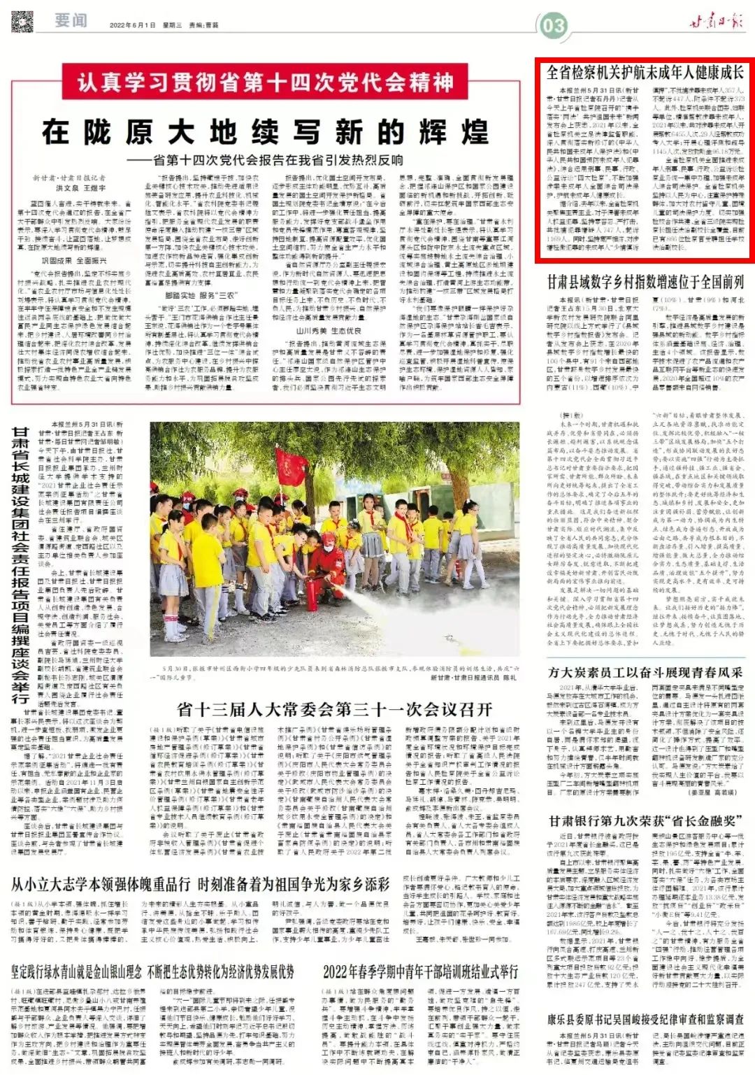 2022年6月1日,甘肃日报三版刊发《全省检察机关护航未成年人健康成长》。