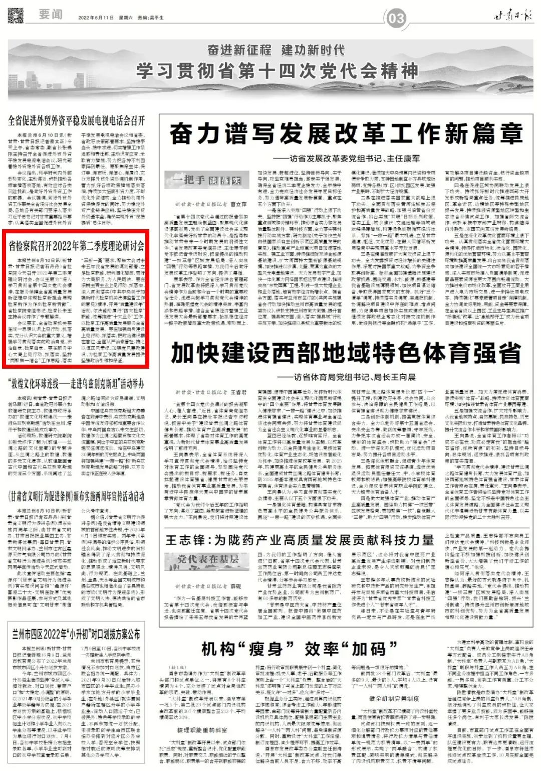 2022年6月11日,甘肃日报三版刊发《省检察院召开2022年第二季度理论研讨会》。