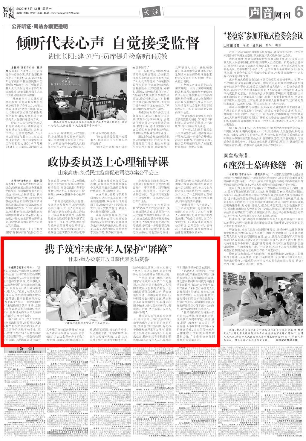 2022年6月13日,检察日报六版刊发《携手筑牢未成年人保护“屏障”——甘肃:举办检察开放日获代表委员赞誉》。