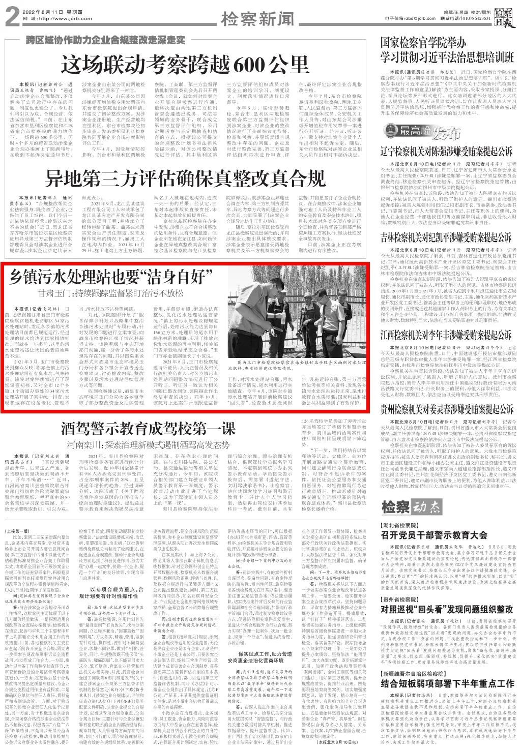 2022年8月11日,检察日报二版刊发《乡镇污水处理站也要“洁身自好”——甘肃玉门:持续跟踪监督紧盯治污不放松》。