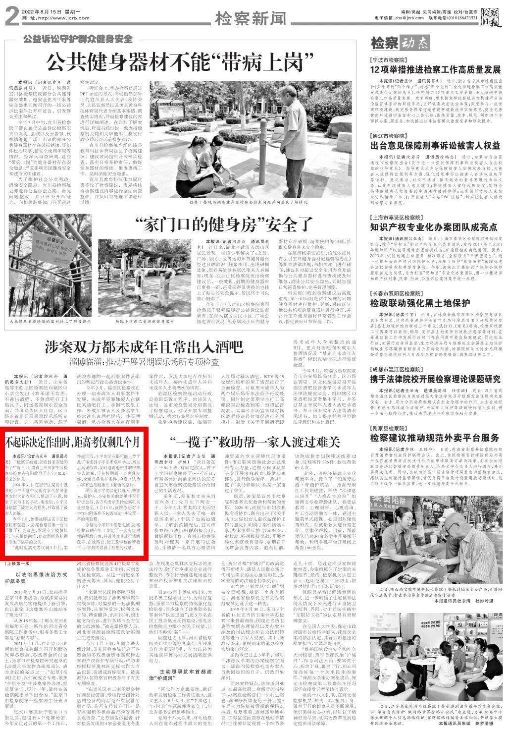 2022年8月15日,检察日报二版刊发《不起诉决定作出时,距高考仅剩几个月》。