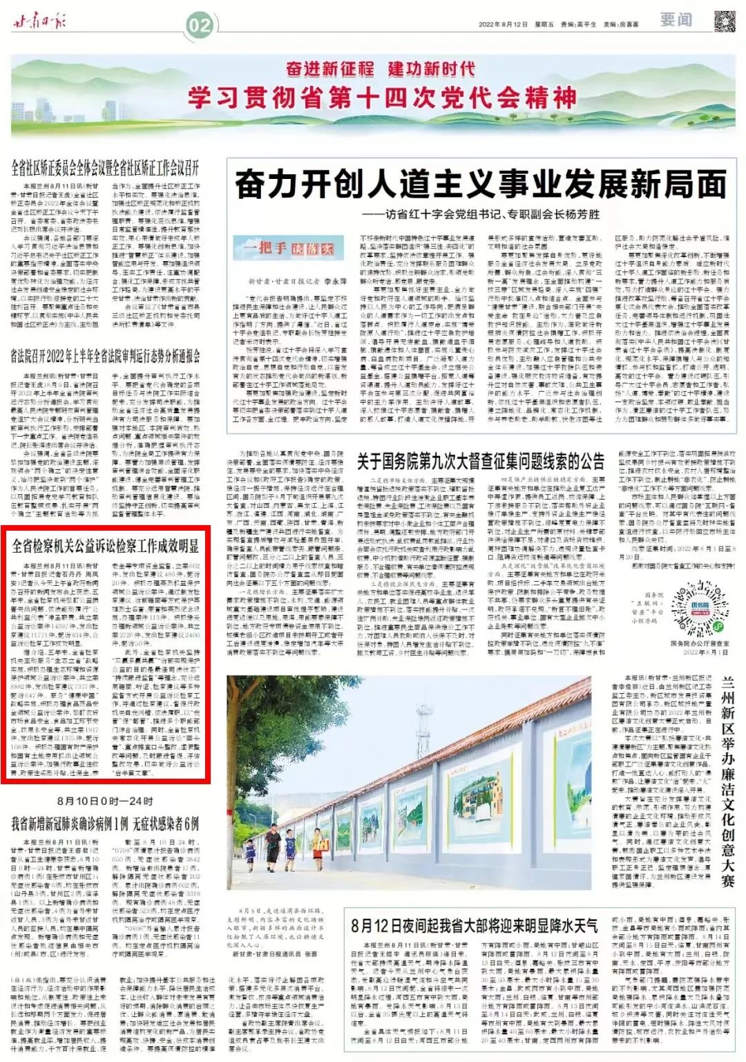 2022年8月12日,甘肃日报二版刊发《全省检察机关公益诉讼检察工作成效明显》。