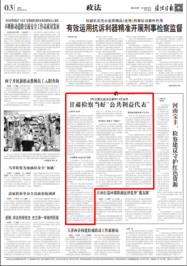 2022年8月17日,法治日报三版刊发《5年立案公益诉讼案件1.4万余件 甘肃检察当好“公共利益代表”》。