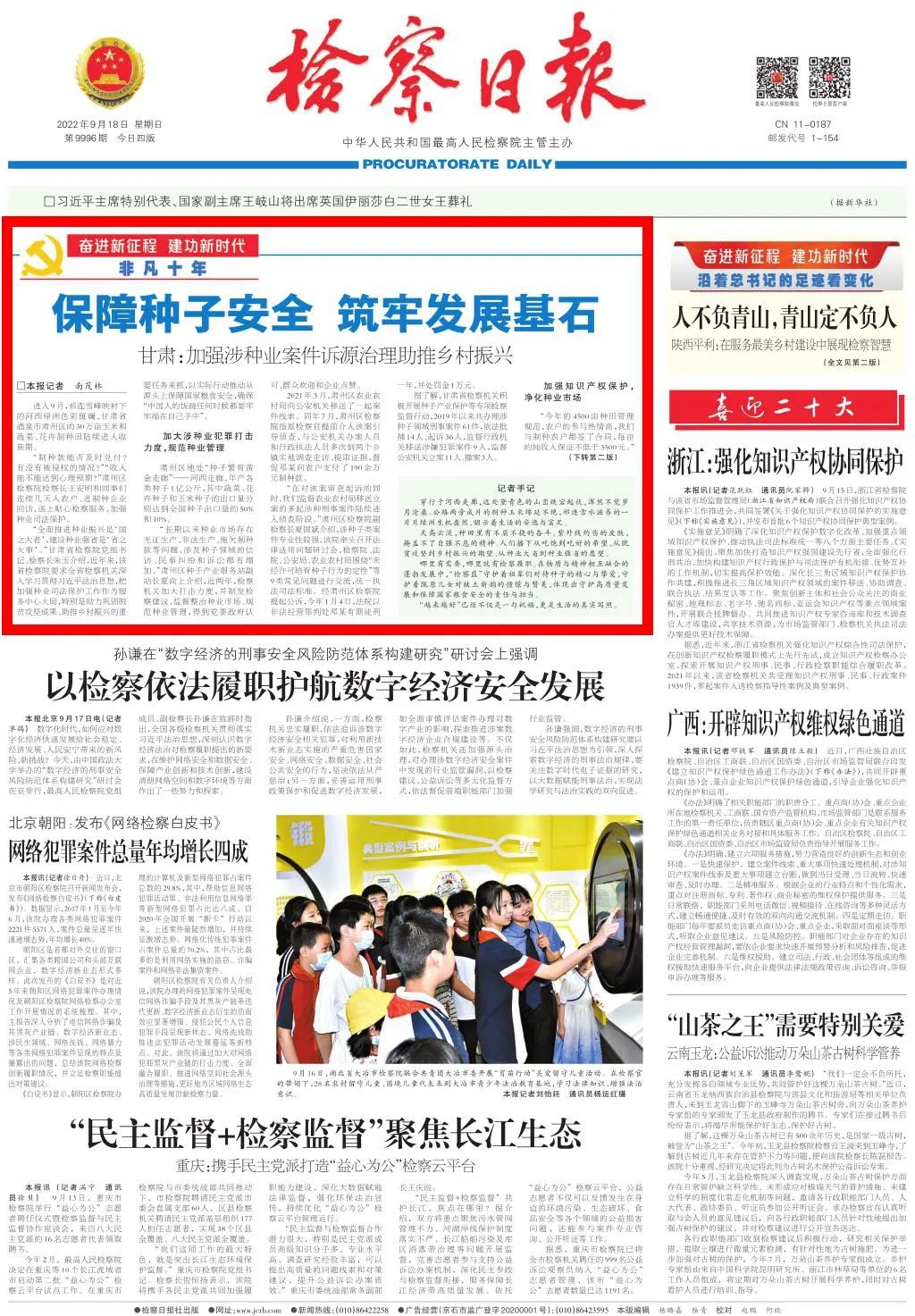 2022年9月18日,检察日报头版头条刊发《保障种子安全 筑牢发展基石——甘肃:加强涉种业案件诉源治理助推乡村振兴》。