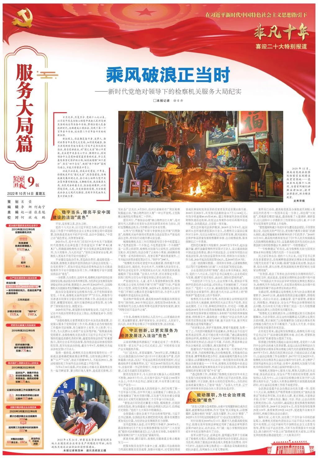 2022年10月14日,检察日报9版、10版喜迎二十大特别报道服务大局篇刊发反映甘肃检察工作的新闻图片。