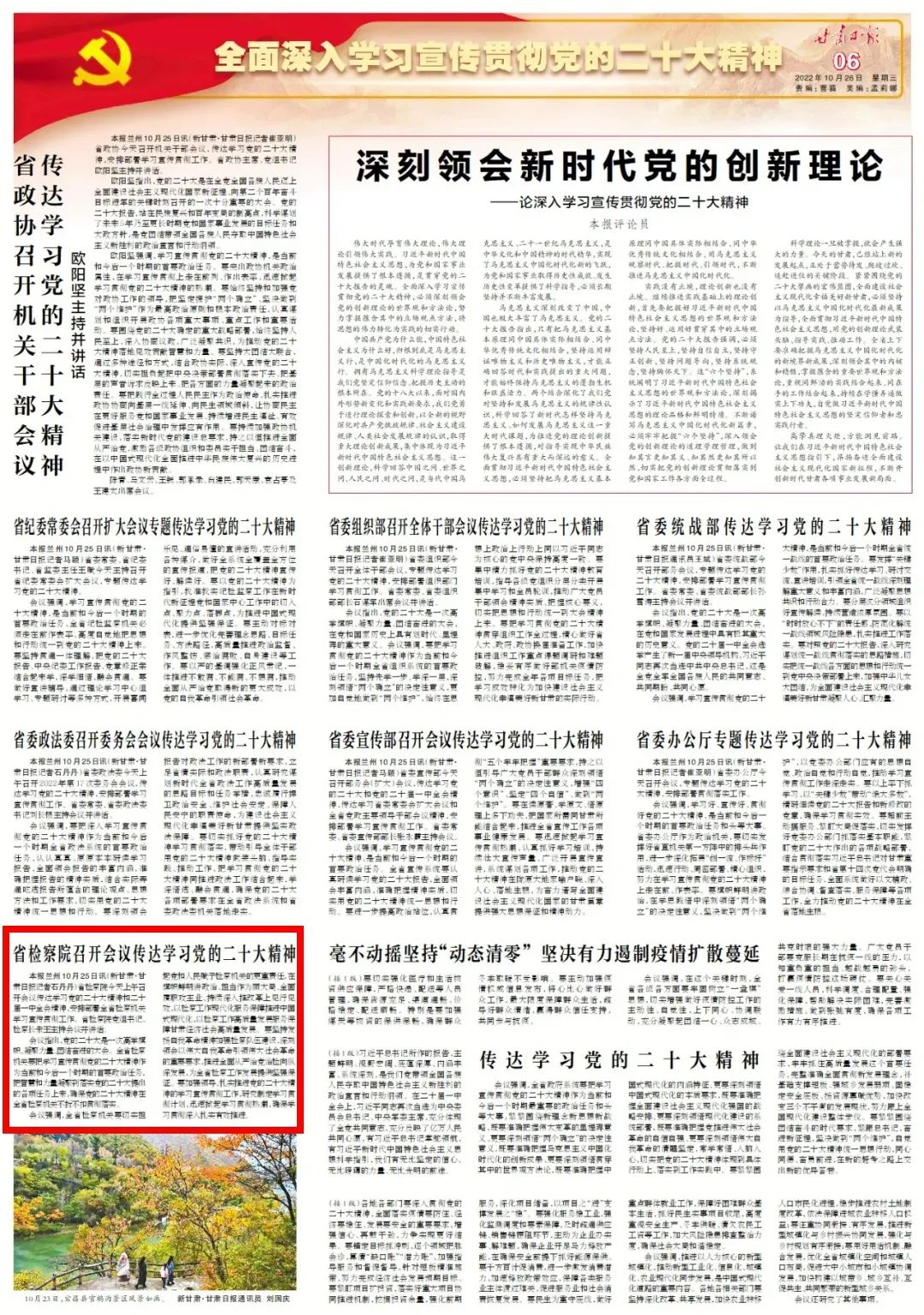2022年10月26日,甘肃日报六版刊发《省检察院召开会议传达学习党的二十大精神》。