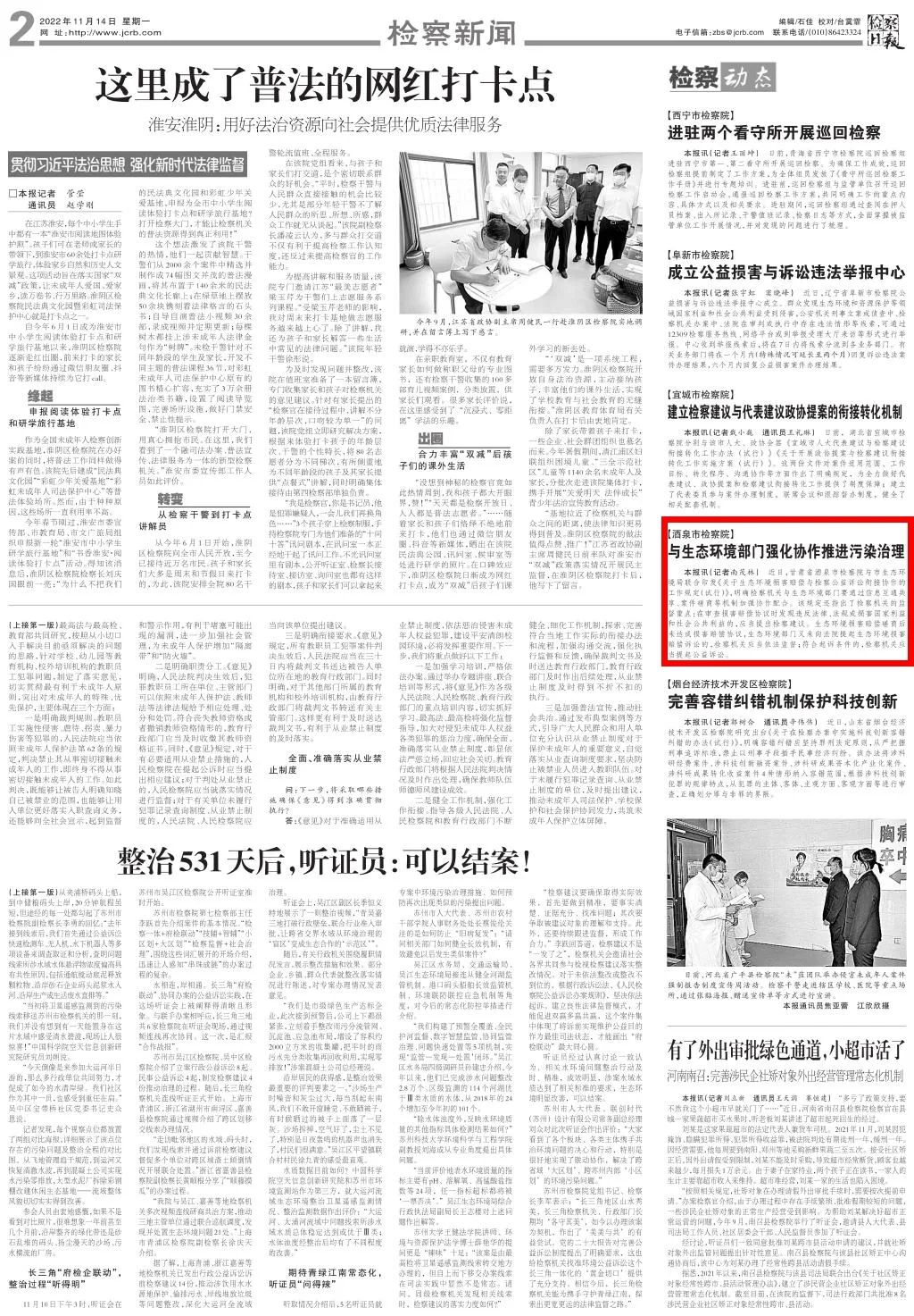 2022年11月14日,检察日报二版刊发《酒泉市检察院:与生态环境部门强化协作推进污染治理》。