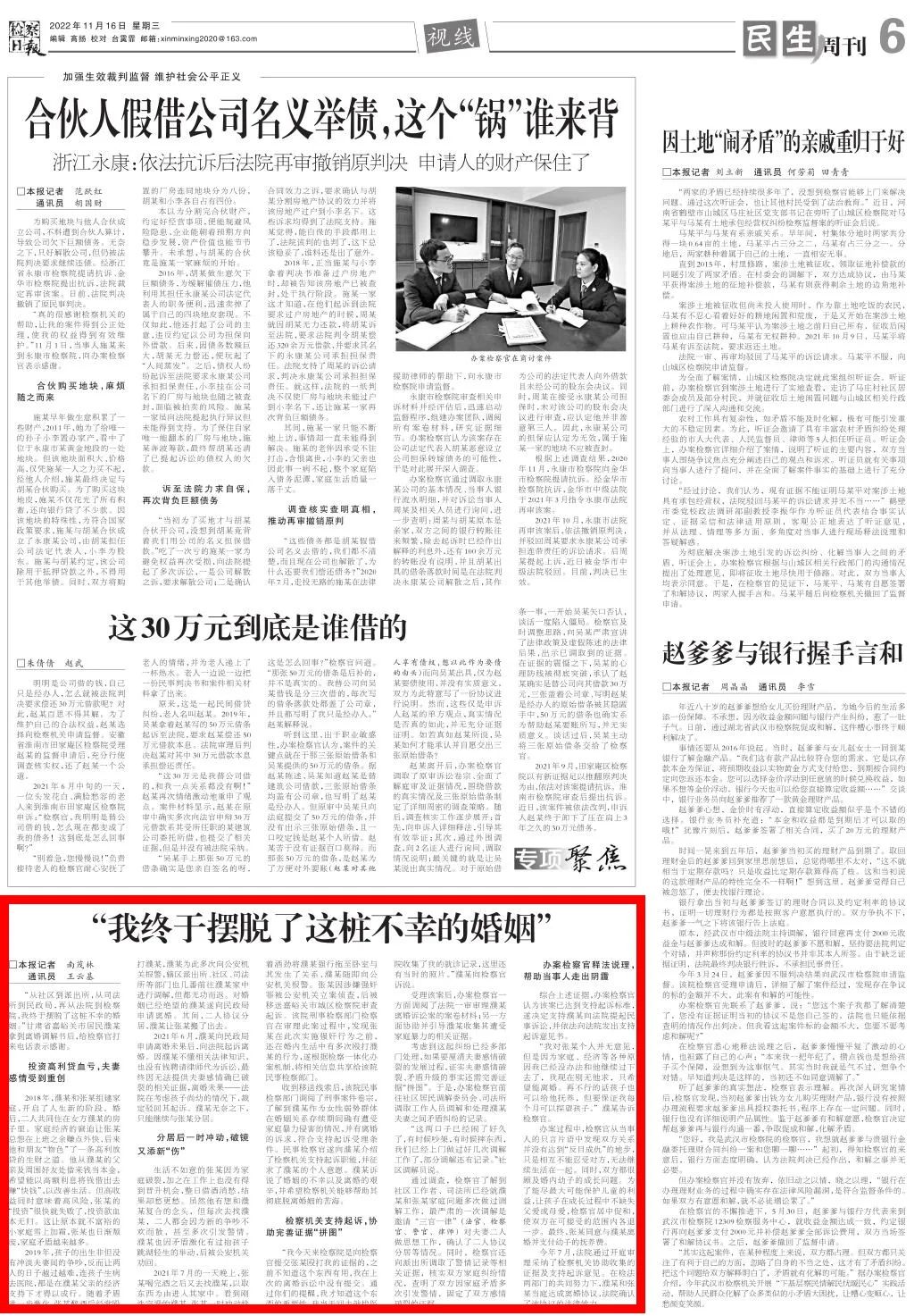 2022年11月16日,检察日报民生周刊刊发《“我终于摆脱了这桩不幸的婚姻”》。
