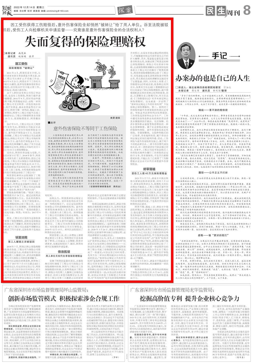 2022年12月14日,检察日报民生周刊刊发《失而复得的保险理赔权》。
