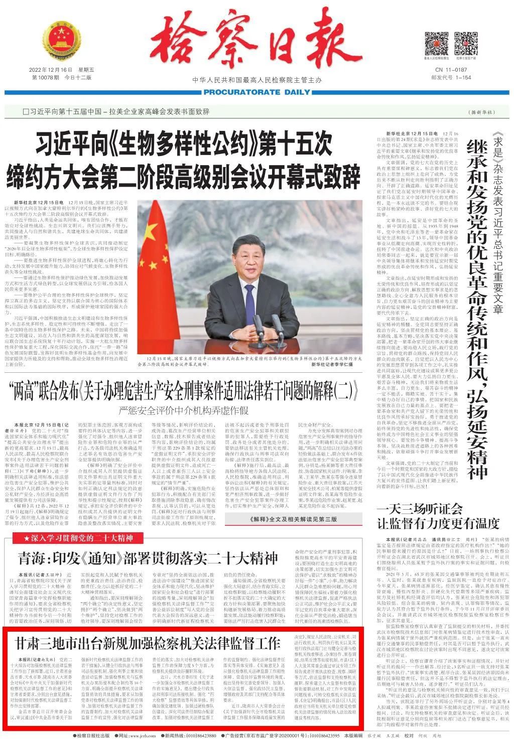 2022年12月16日,检察日报头版刊发《甘肃三地市出台新规加强检察机关法律监督工作》。