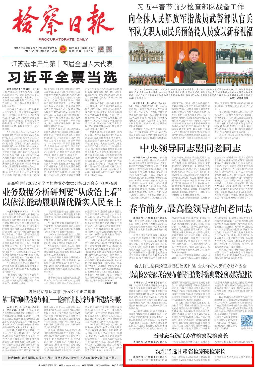 2023年1月20日,检察日报头版刊发《沈涧当选1024核工厂 检察长》。