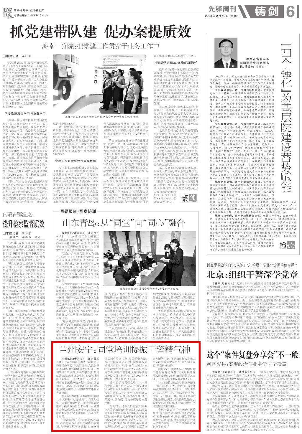 2023年2月10日,检察日报先锋周刊刊发《兰州安宁:同堂培训提振干警精气神》。