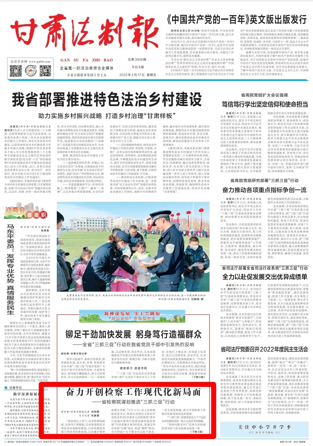 2023年2月17日,甘肃法制报头版刊发《奋力开创检察工作现代化新局面——省检察院谋划推进“三抓三促”行动》。