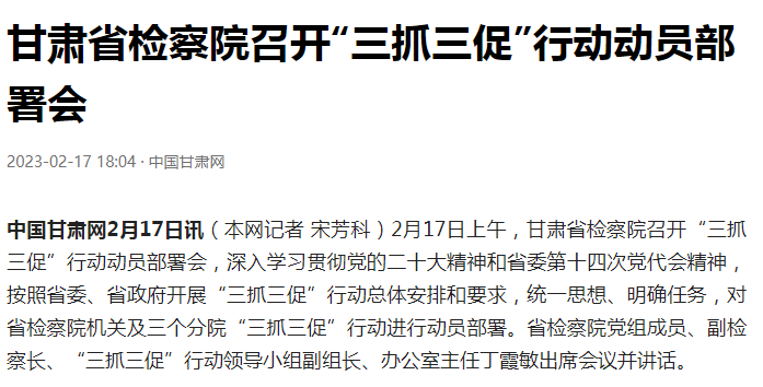 会议强调,开展“三抓三促”行动,要对标对表省委、省政府的部署要求,明确目标任务,坚持问题导向,细化落实举措,不断增强“三抓三促”的针对性、科学性和规范性,确保行动始终沿着正确方向纵深推进。要聚焦法律监督能力短板抓学习促提升,突出能力为先的导向,勤学苦练强本领、如饥似渴促进素质大提升,努力满足新时代党和人民对检察工作的新要求新期待。要聚焦落地见效难题抓执行促落实,突出执行为要的导向,针对“不执行、乱执行”“执行不到位”“选择性执行”问题,不断健全完善工作机制,深化全周期管理,实施闭环式运行,形成一级抓一级、层层抓落实的良好局面。要聚焦检察现代化发展瓶颈抓效能促发展,突出效能为王的导向,着力在工作效能提升、重点任务落实、发展指标进位上下功夫,形成一心一意谋发展、埋头苦干抓发展、全力以赴促发展的鲜明导向和浓厚氛围,以检察工作高质量发展助推甘肃经济社会高质量发展。