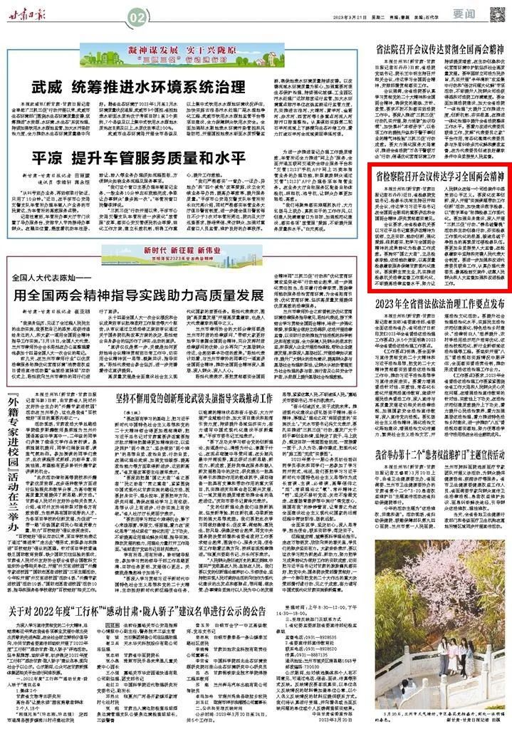 2023年3月21日,甘肃日报二版刊发《省检察院召开会议传达学习全国两会精神》。