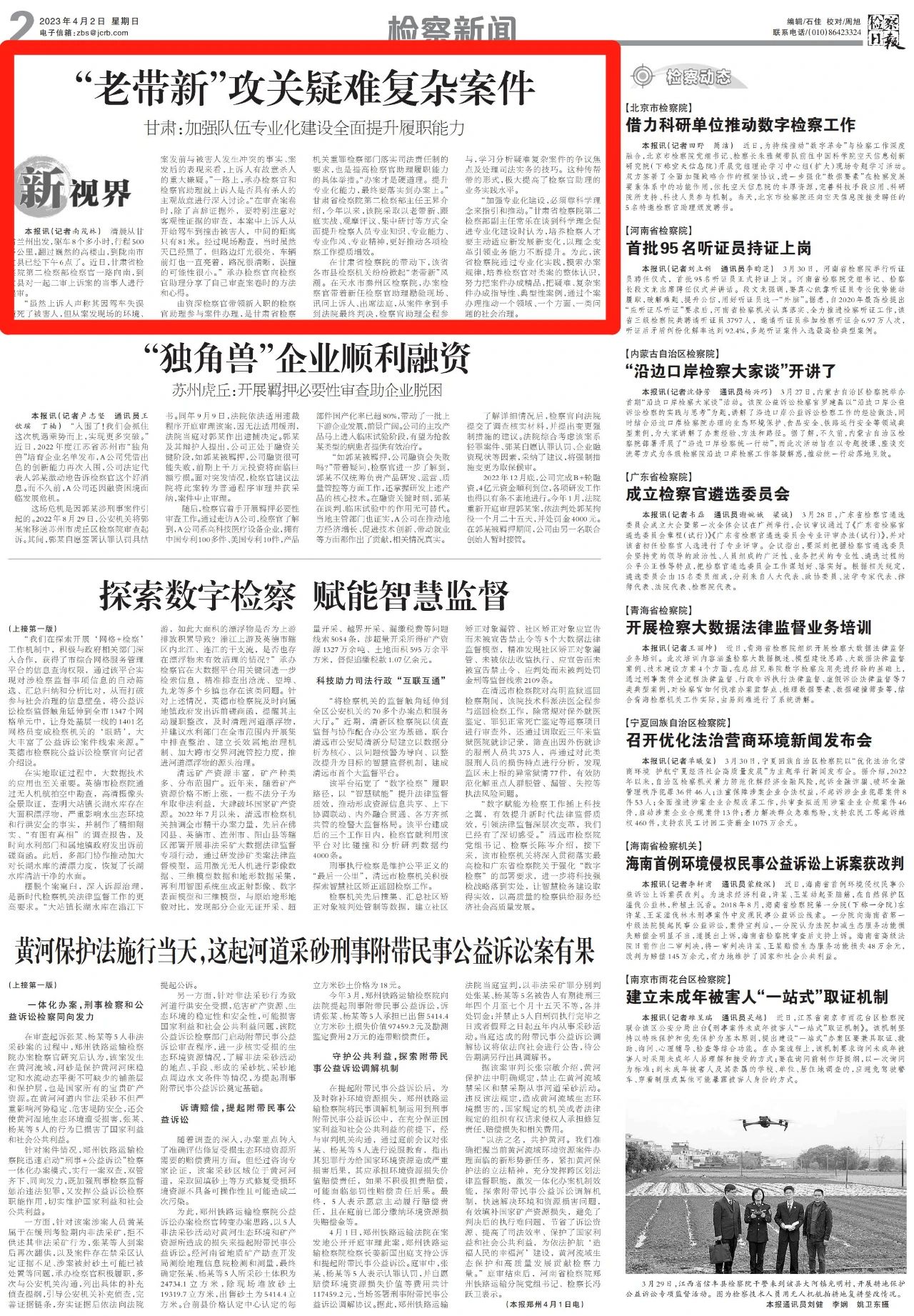 2023年4月2日,检察日报二版头条刊发《“老带新”攻关疑难复杂案件——甘肃:加强队伍专业化建设全面提升履职能力》。