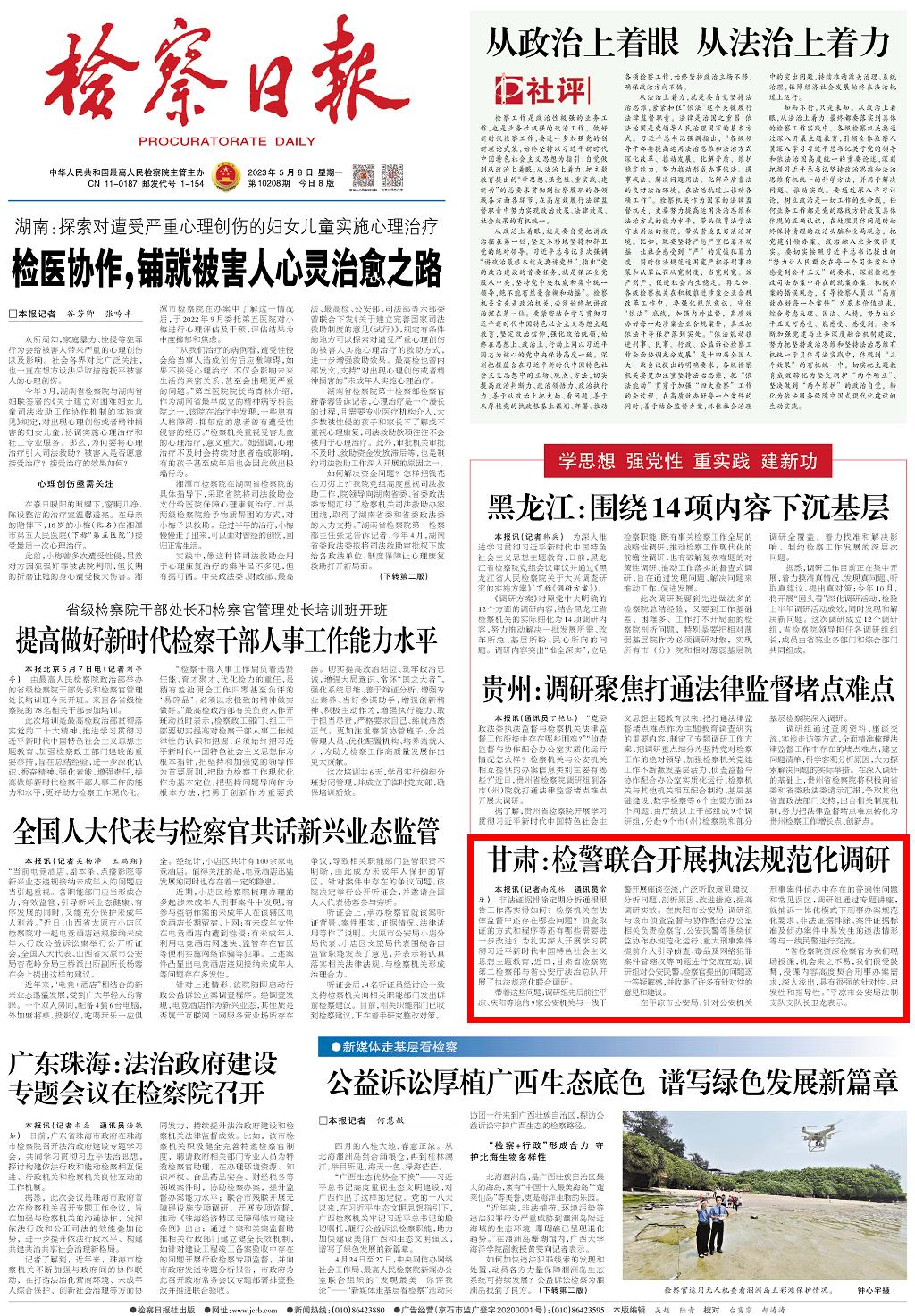 2023年5月8日,检察日报头版刊发《甘肃:检警联合开展执法规范化调研》。
