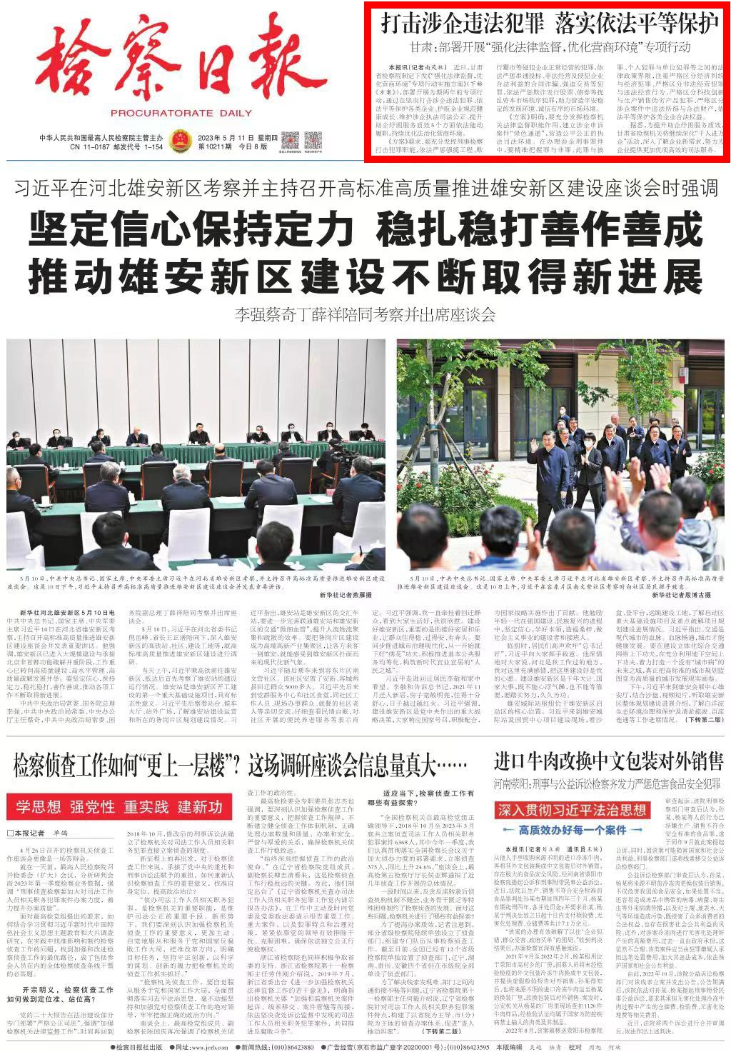 2023年5月11日,检察日报头版刊发《打击涉企违法犯罪 落实依法平等保护——甘肃:部署开展“强化法律监督,优化营商环境”专项行动》。