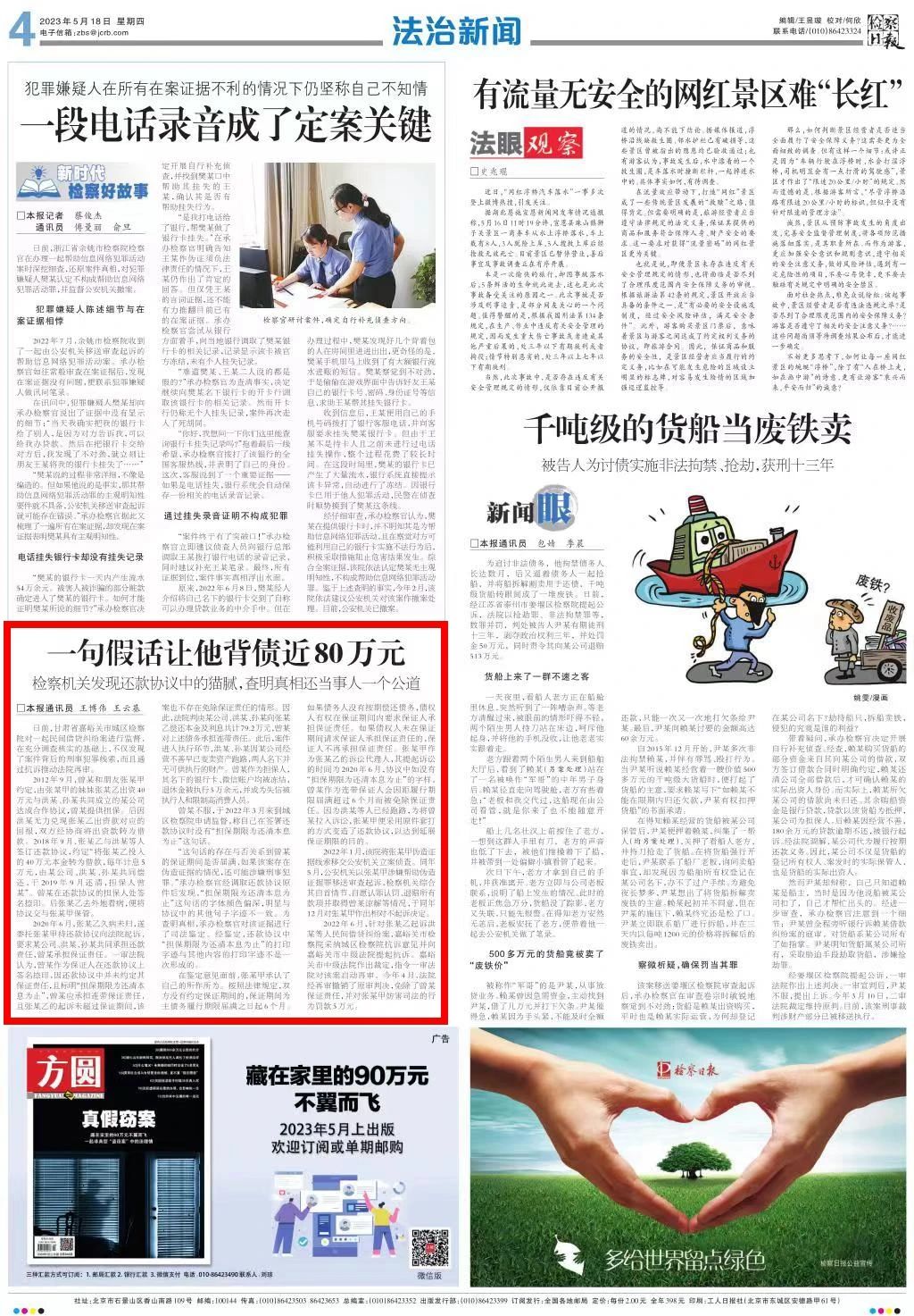 2023年5月18日,检察日报四版刊发《一句假话让他背债近80万元——检察机关发现还款协议中的猫腻,查明真相还当事人一个公道》。