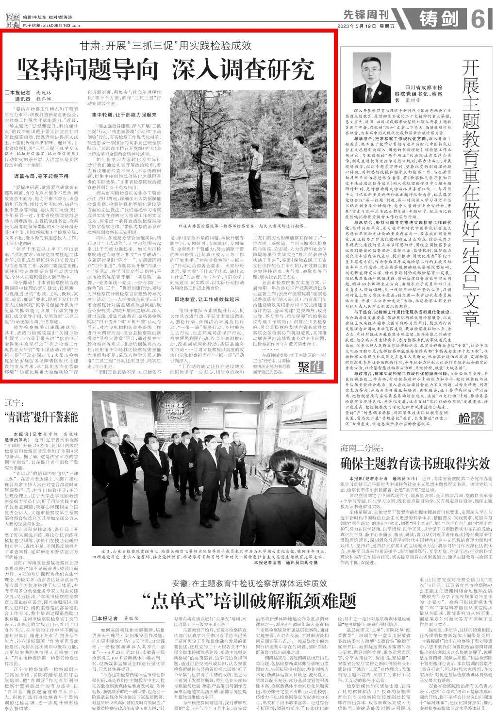 2023年5月19日,检察日报先锋周刊刊发《坚持问题导向 深入调查研究——甘肃:开展“三抓三促”用实践检验成效》。