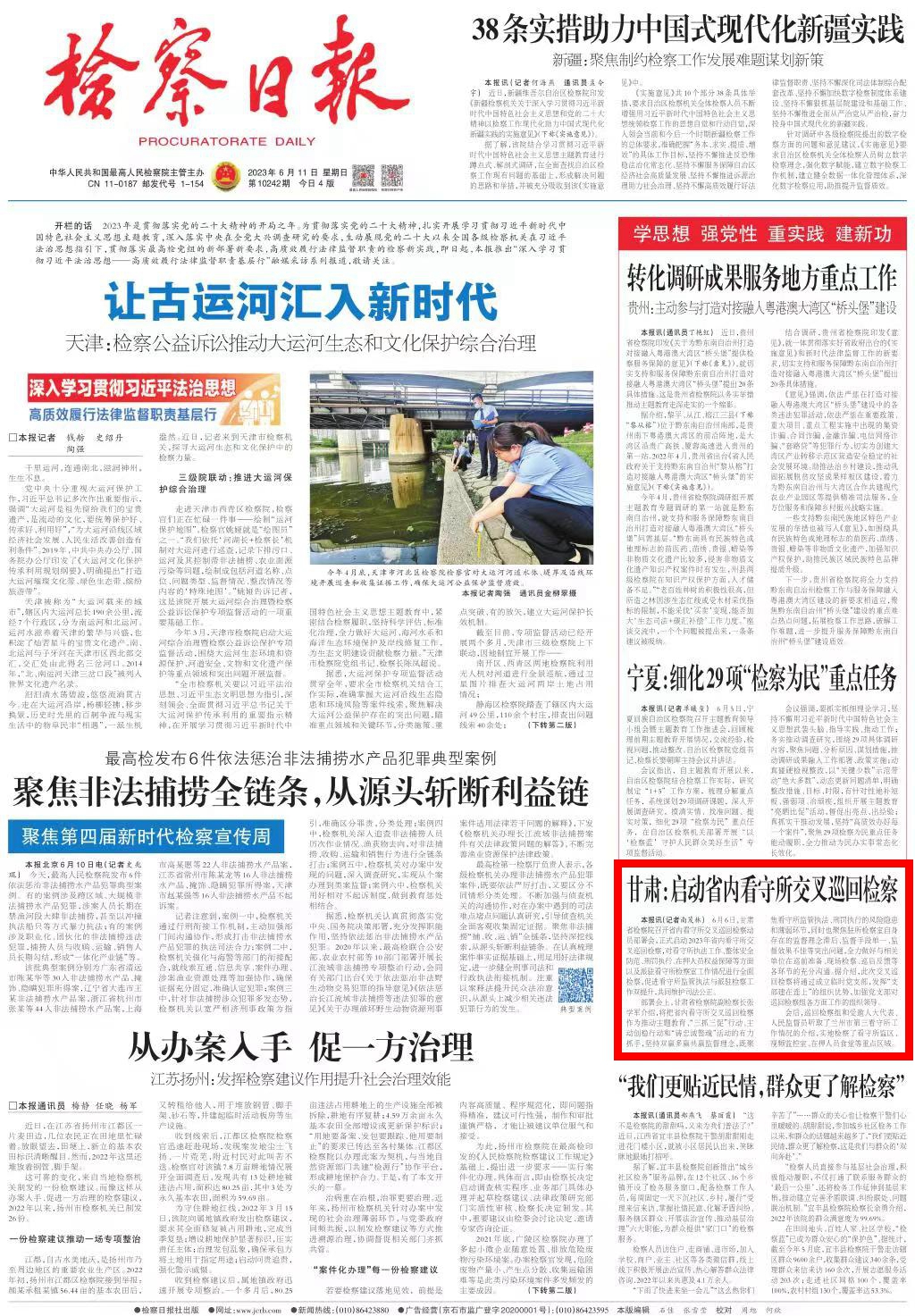 2023年6月11日,检察日报头版刊发《甘肃:启动省内看守所交叉巡回检察》。