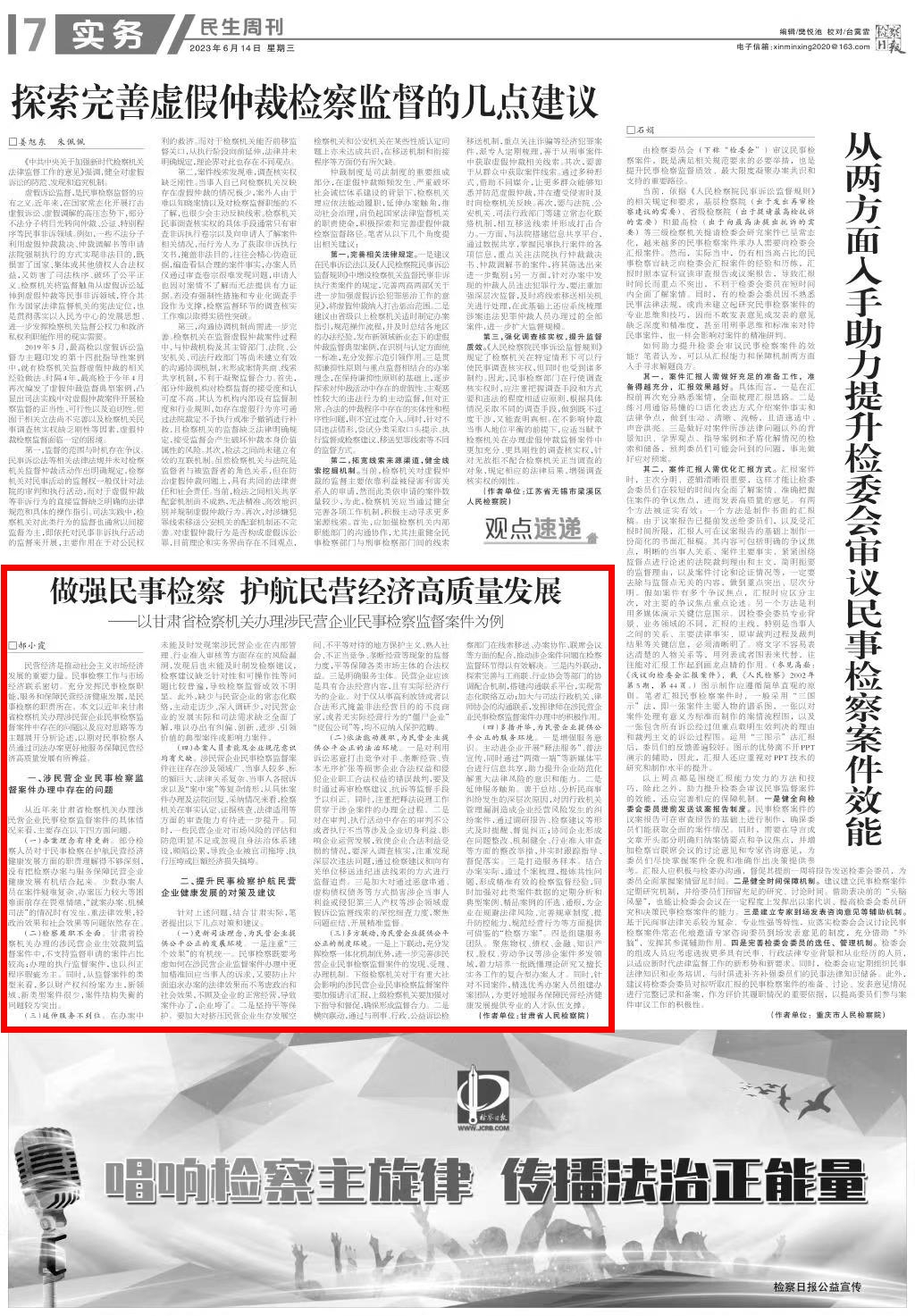 2023年6月14日,检察日报民生周刊刊发《做强民事检察 护航民营经济高质量发展——以甘肃省检察机关办理涉民营企业民事检察监督案件为例》。