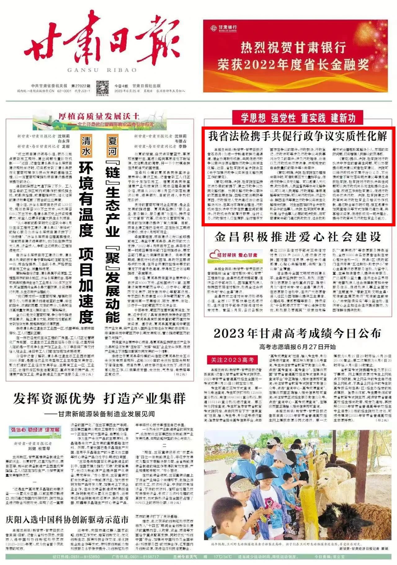 2023年6月25日,甘肃日报头版刊发《我省法检携手共促行政争议实质性化解》。
