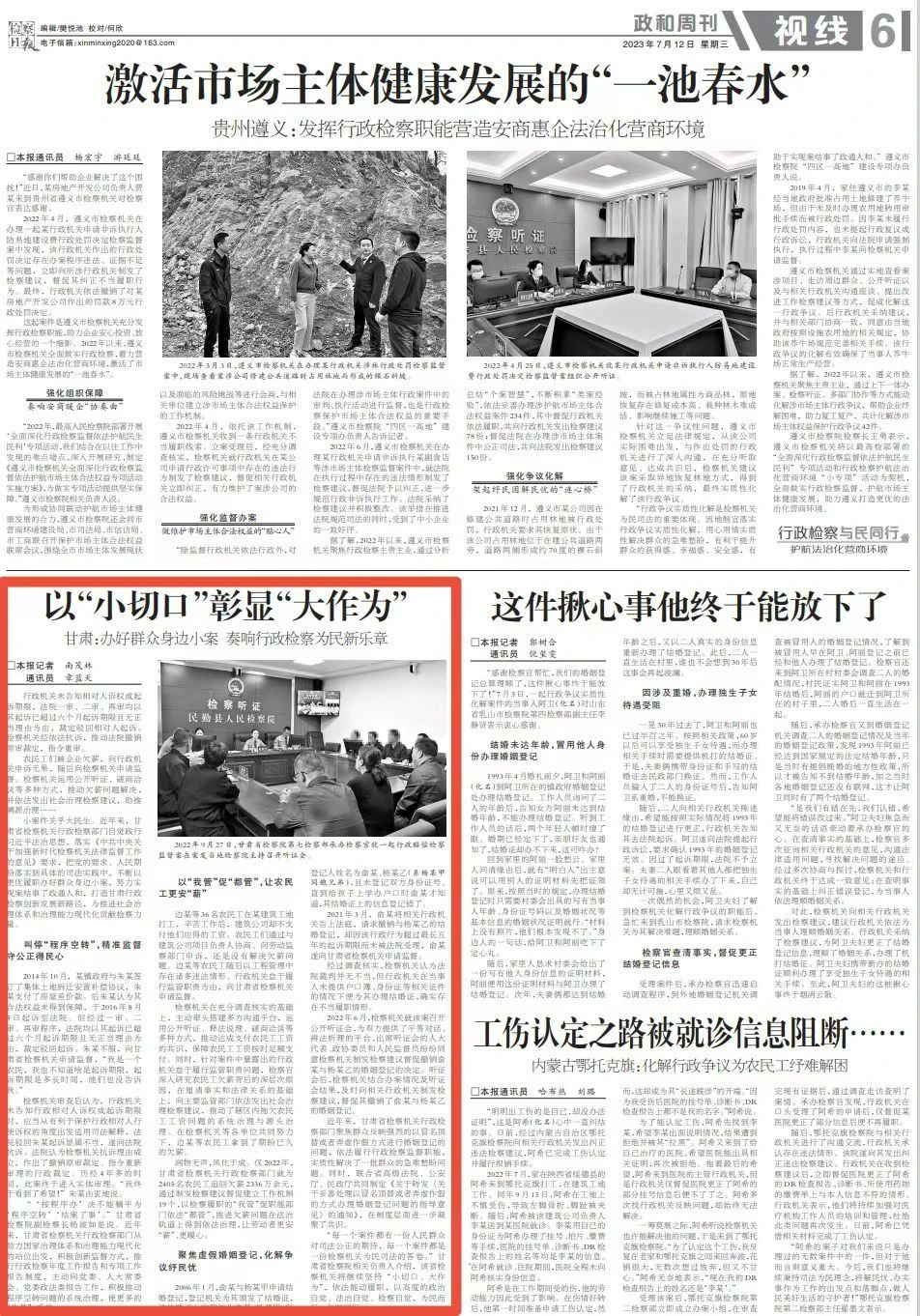2023年7月12日,检察日报政和周刊刊发《以“小切口”彰显“大作为”——甘肃:办好群众身边小案 奏响行政检察为民新乐章》。