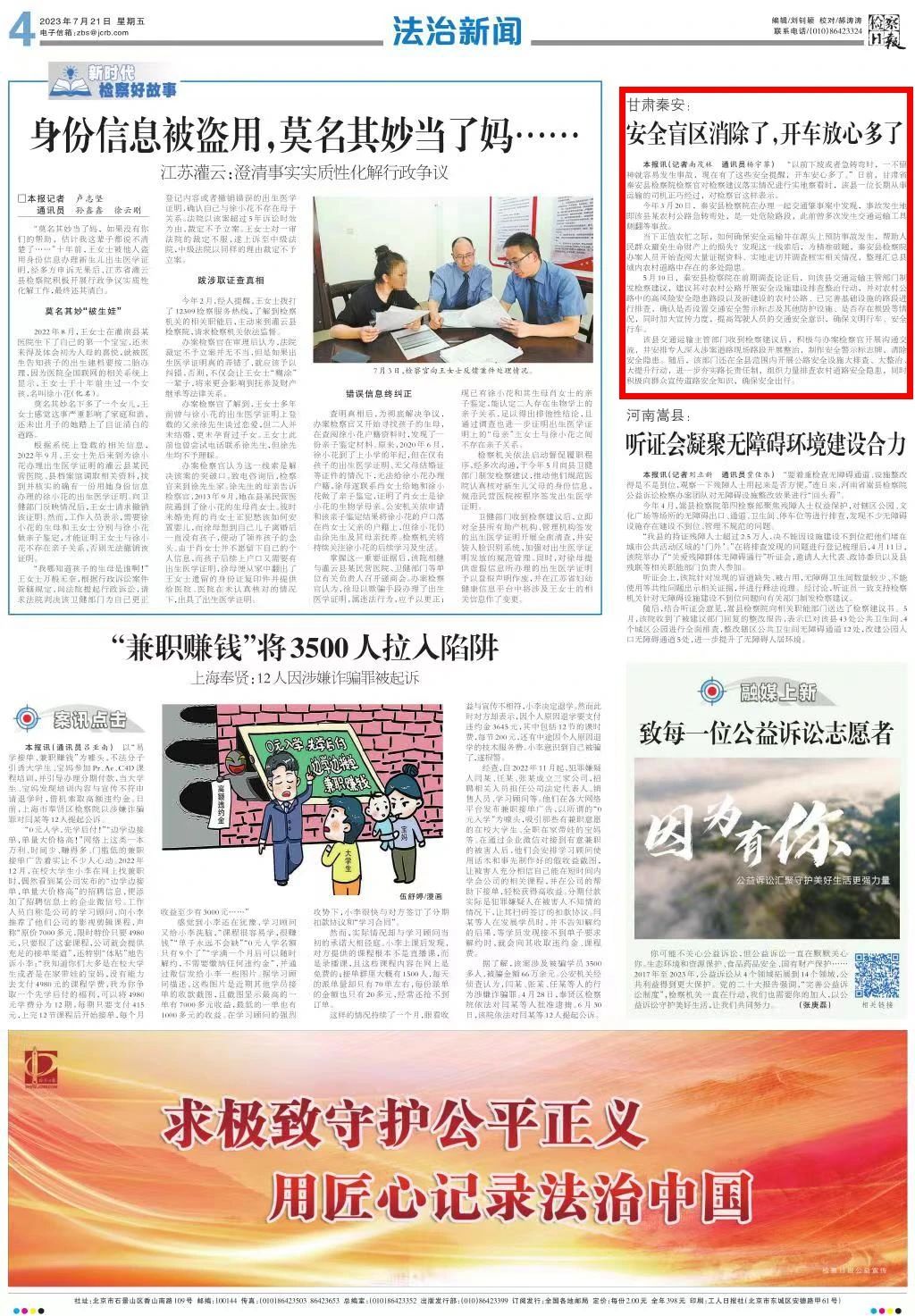 2023年7月21日,检察日报刊发《甘肃秦安:安全盲区消除了,开车放心多了》。