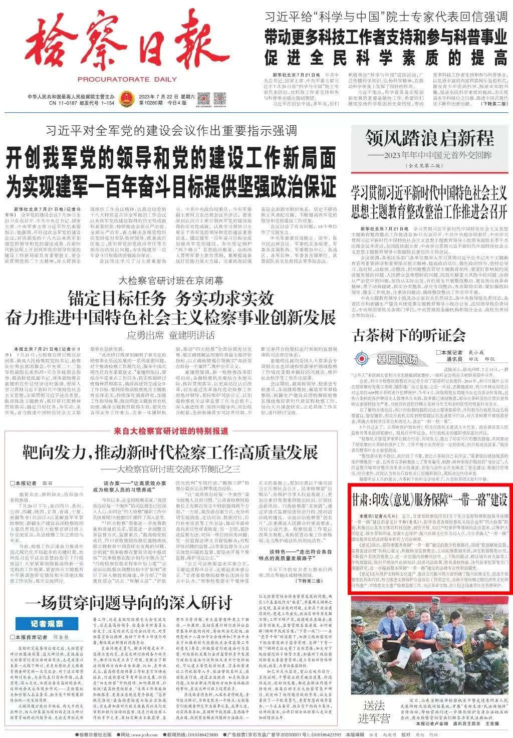 2023年7月22日,检察日报头版刊发《甘肃:印发〈意见〉服务保障“一带一路”建设》。