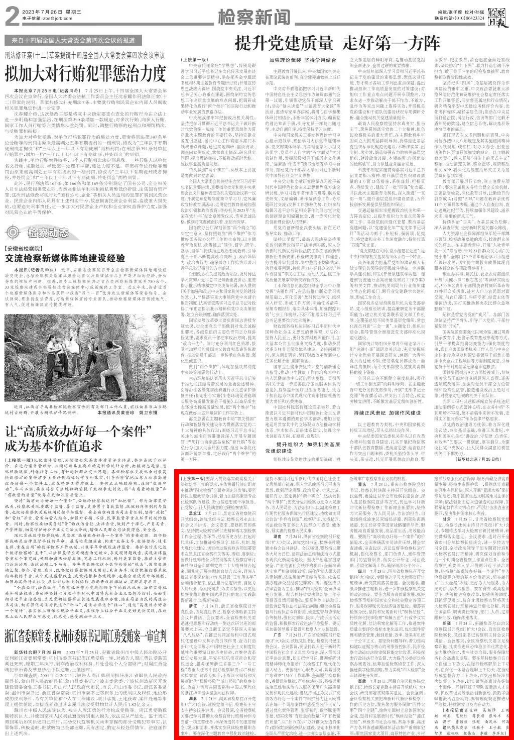 2023年7月26日,检察日报头版刊发《切实把思想行动统一到新要求新部署上来——各地检察机关深入学习贯彻大检察官研讨班精神系列报道之一》。