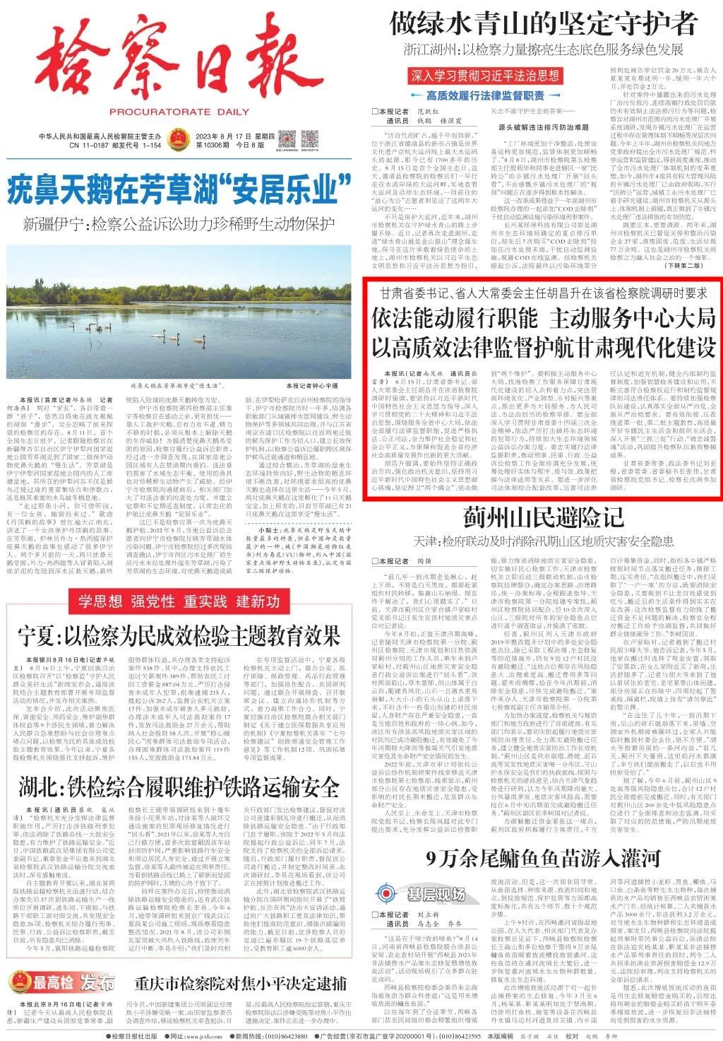 2023年8月17日,检察日报头版刊发《甘肃省委书记、省人大常委会主任胡昌升在该省检察院调研时要求 依法能动履行职能 主动服务中心大局 以高质效法律监督护航甘肃现代化建设》。