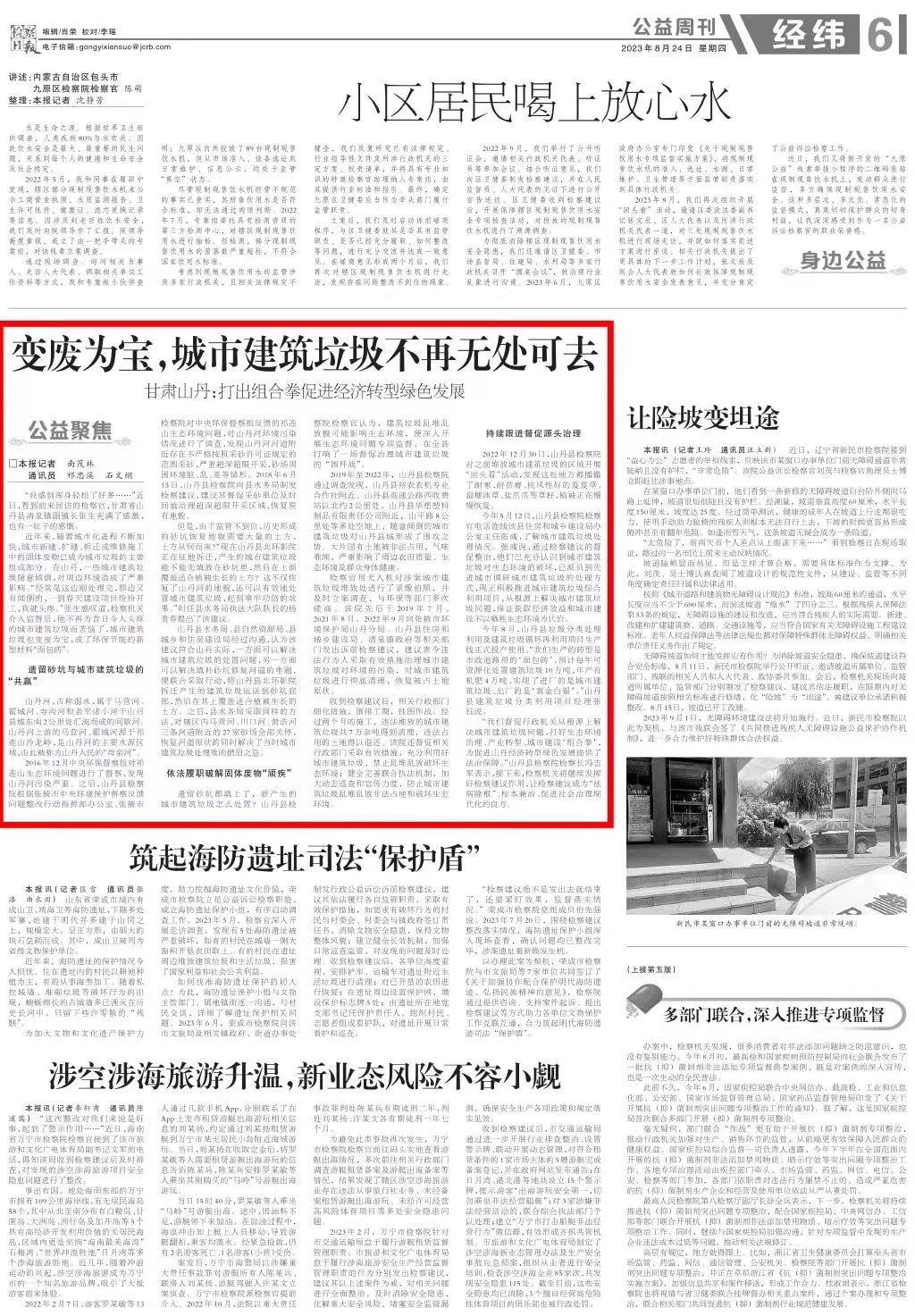 2023年8月24日,检察日报公益周刊刊发《变废为宝,城市建筑垃圾不再无处可去——甘肃山丹:打出组合拳促进经济转型绿色发展》。