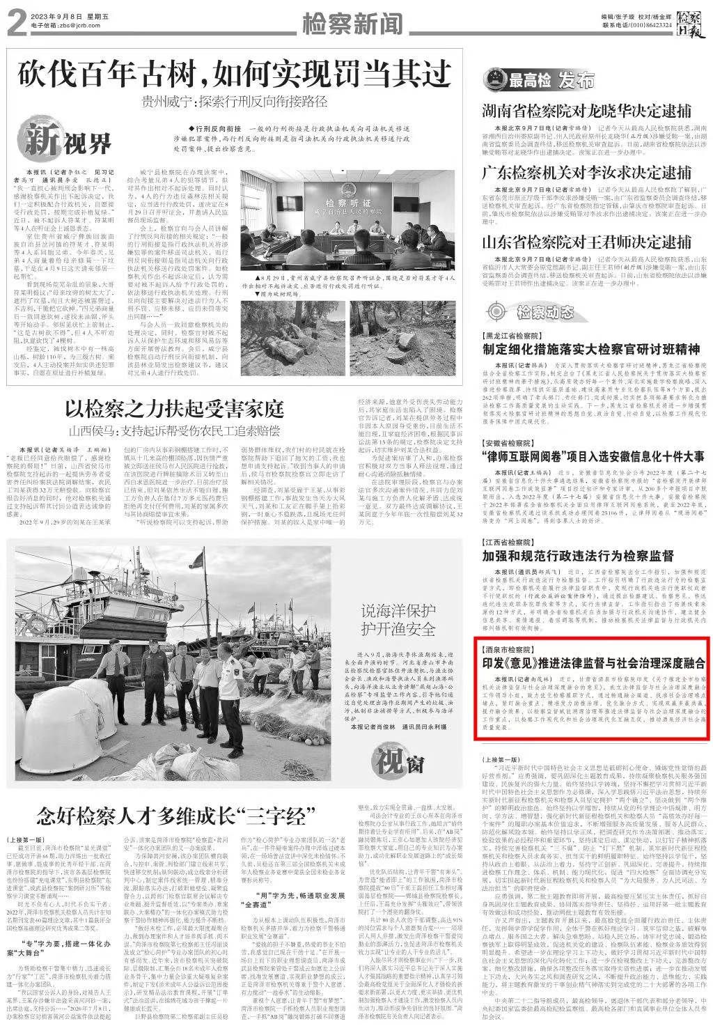 2023年9月8日,检察日报刊发《酒泉市检察院:印发〈意见〉推进法律监督与社会治理深度融合》。