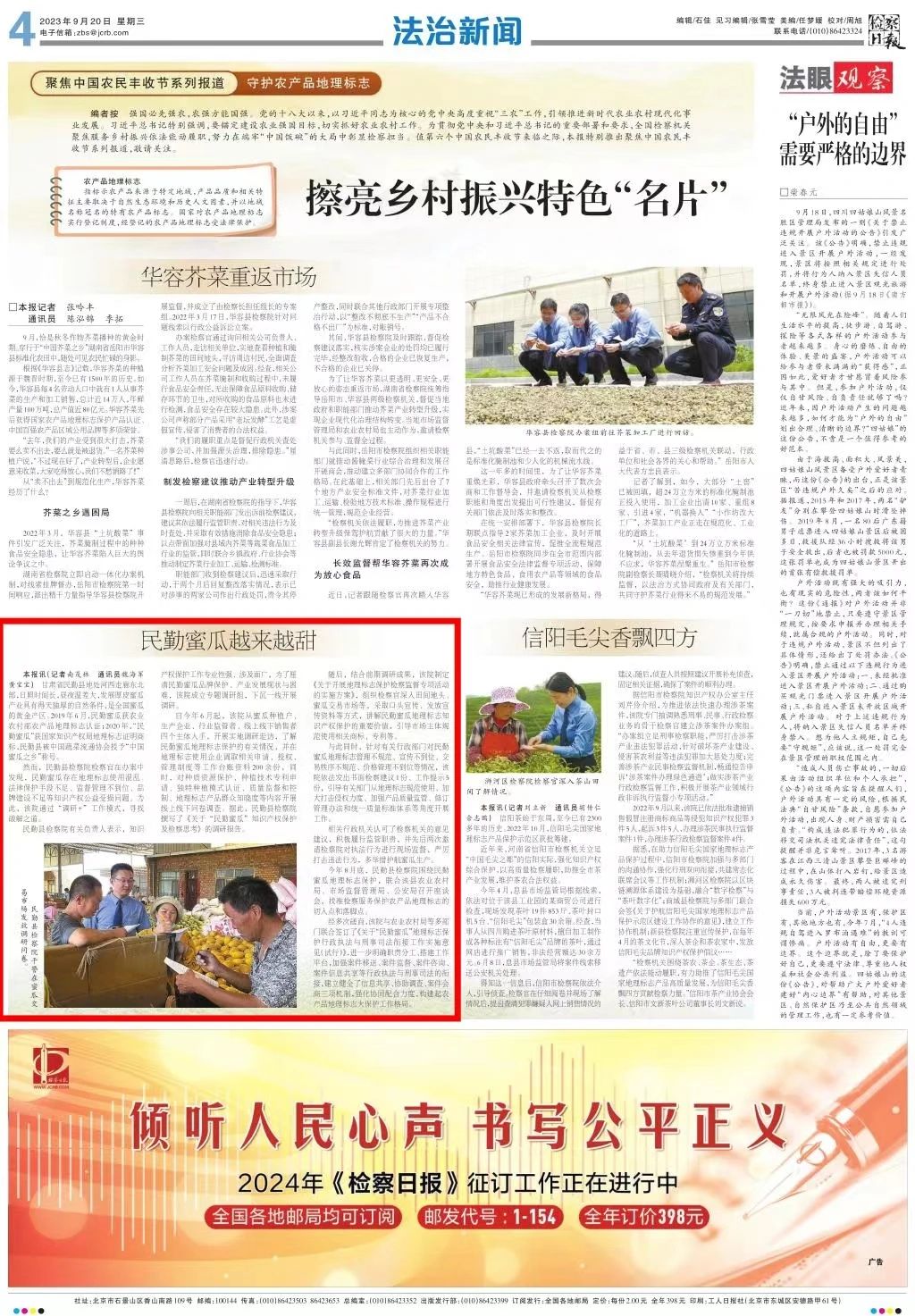 2023年9月20日,检察日报刊发《民勤蜜瓜越来越甜》。