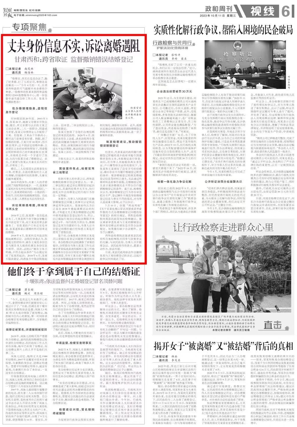 2023年10月11日,检察日报政和周刊刊发《丈夫身份信息不实,诉讼离婚遇阻——甘肃西和:跨省取证 监督撤销错误结婚登记》。