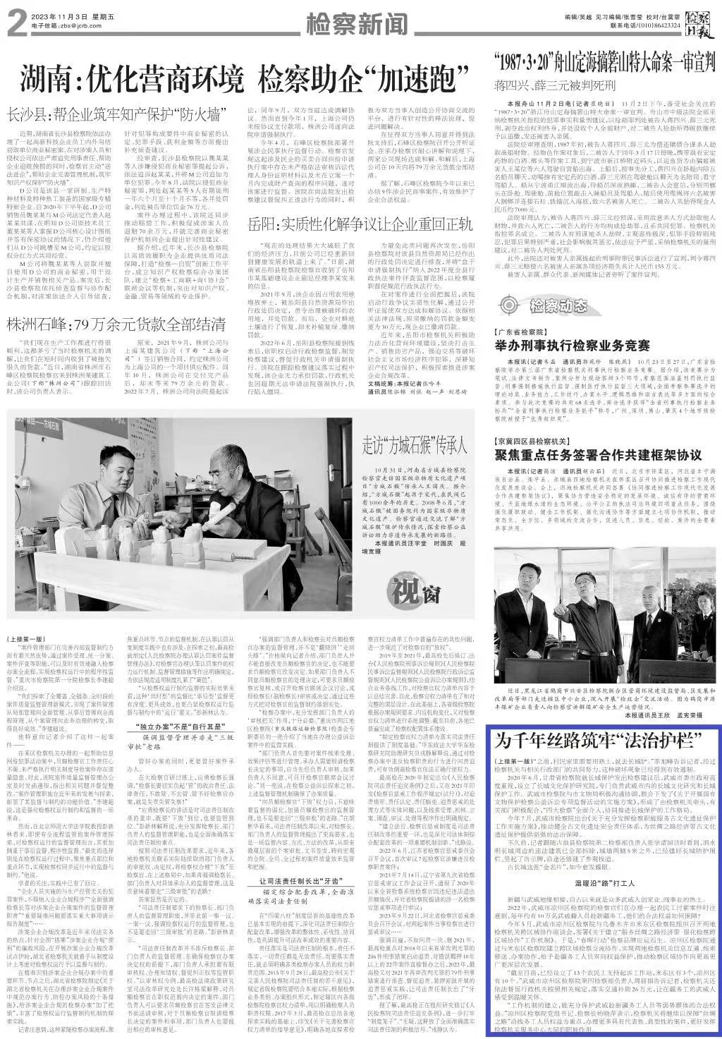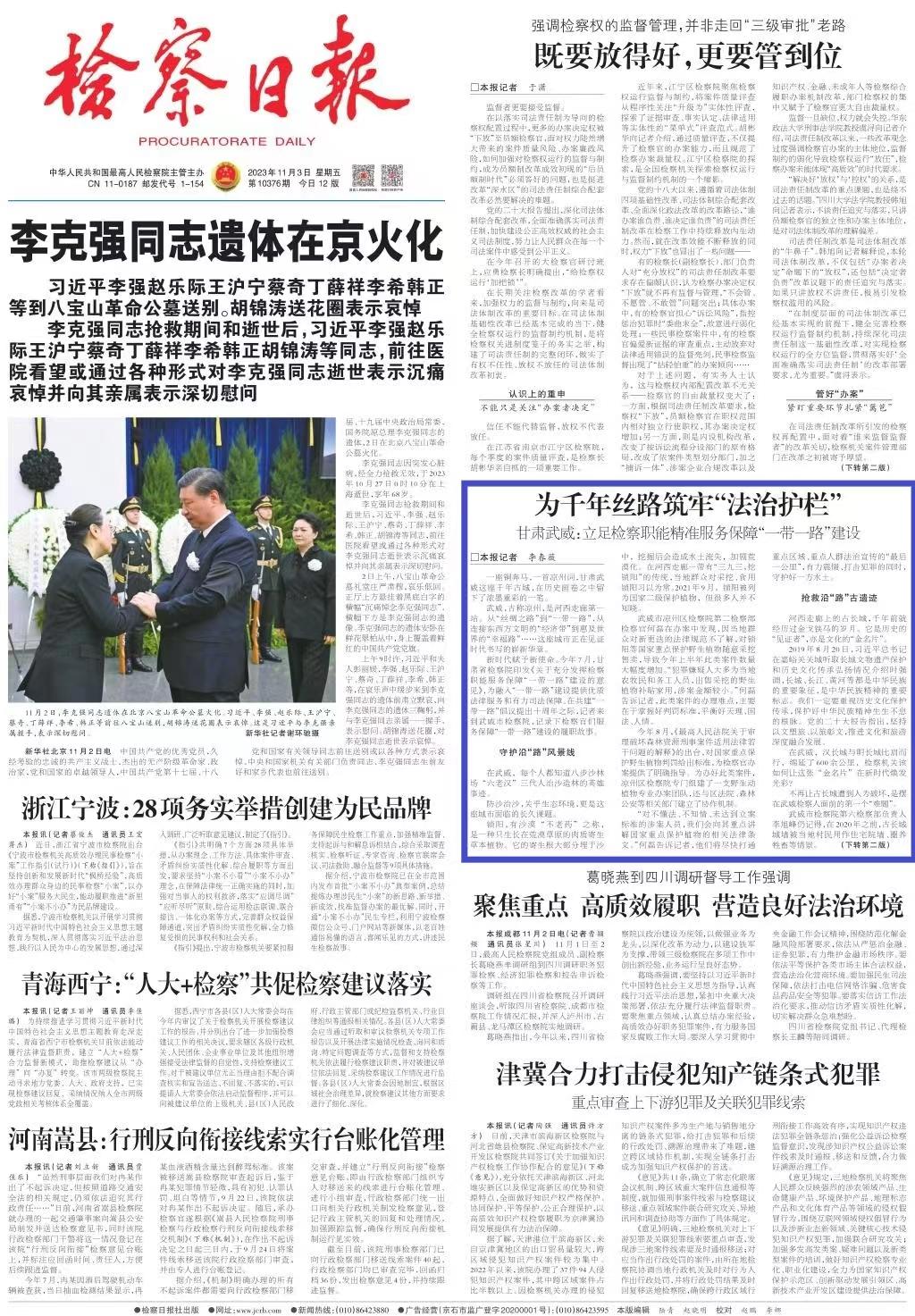 2023年11月3日,检察日报头版刊发《为千年丝路筑牢“法治护栏”——甘肃武威:立足检察职能精准服务保障“一带一路”建设》。