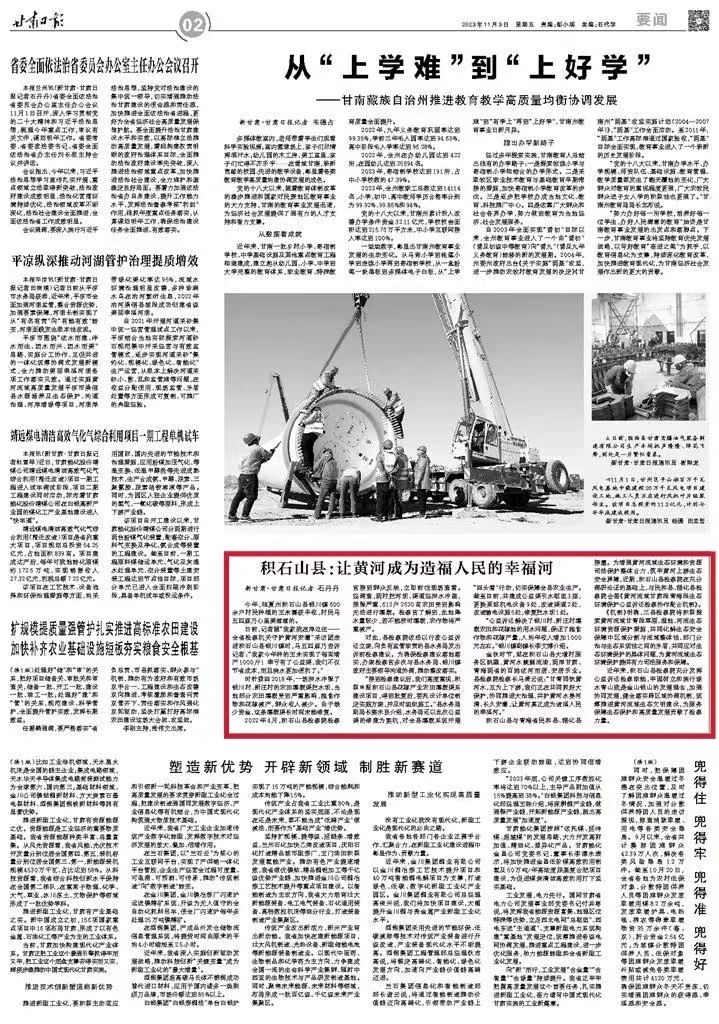 2023年11月3日,甘肃日报刊发《积石山县:让黄河成为造福人民的幸福河》。